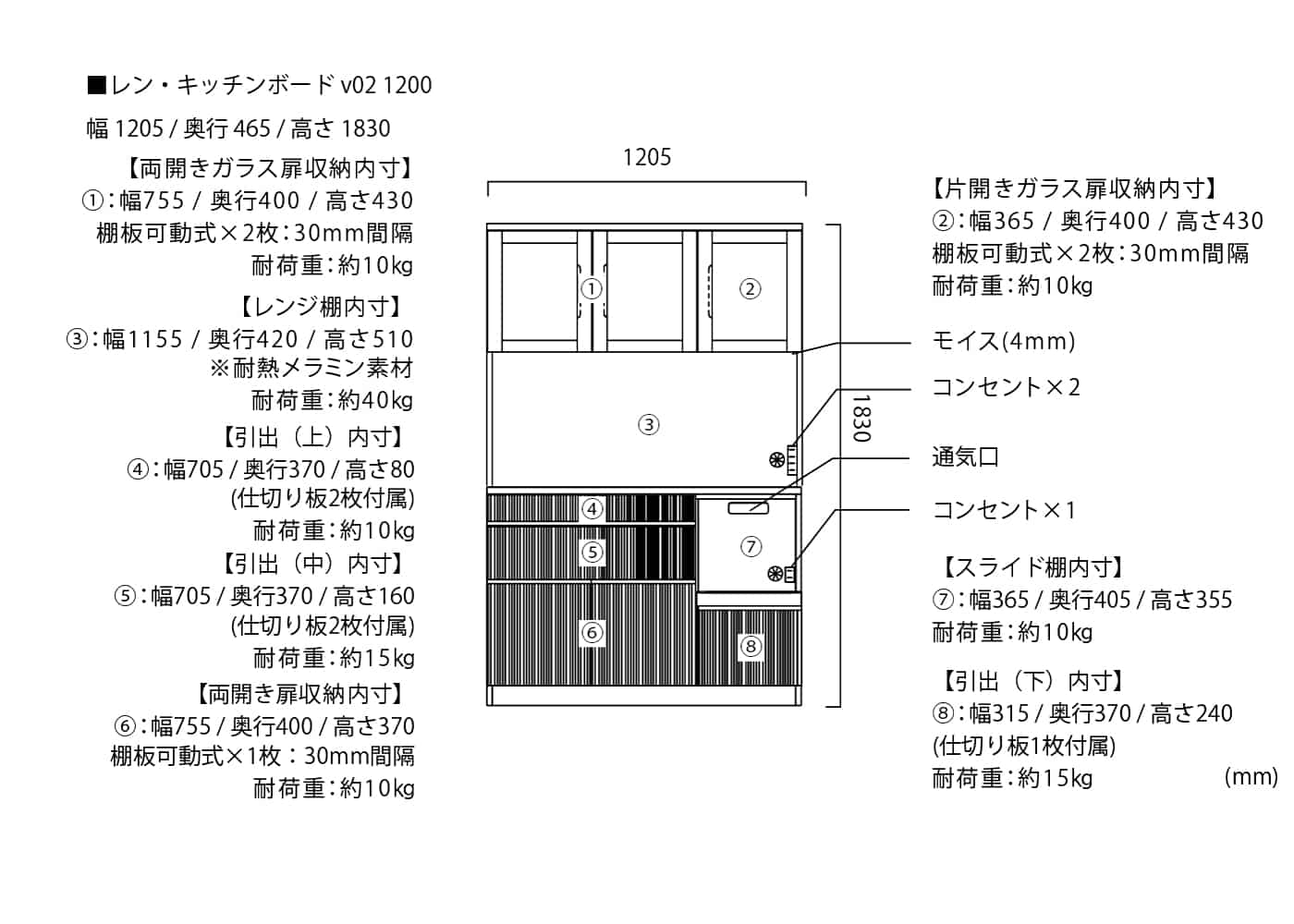 幅1205 / 奥行465 / 高さ1830 ※単位は mm
