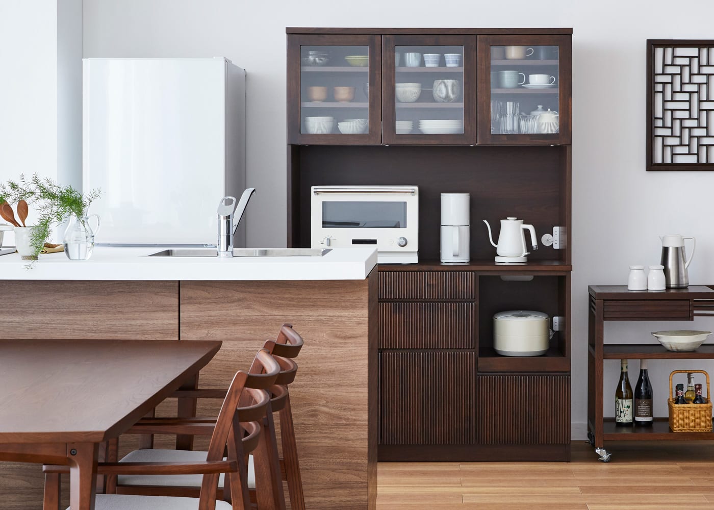 無垢材の持つ上品な存在感や、木の風合いを楽しめます。レン・キッチンボードv02 1200を主役にして、快適なキッチンライフを実現してみましょう。