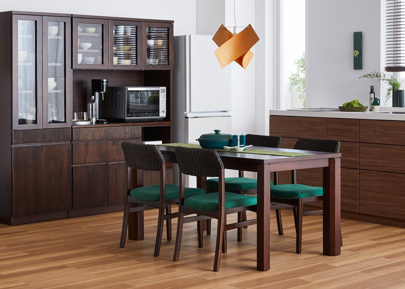 チェアカバーで彩れば、癒し感のあるダイニングを演出できます。(写真はレン・キッチンボード1200と