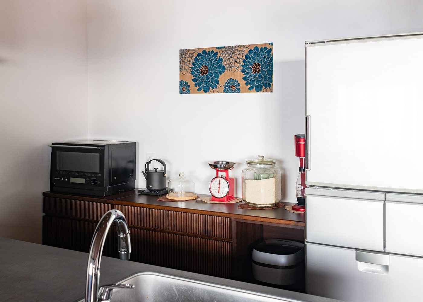 大人の休日をテーマにした、おしゃれなマンションのリノベーション事例。キッチン内の家具やインテリアにもこだわり、縦ラインのキッチン収納と壁面装飾でコーディネートしました。