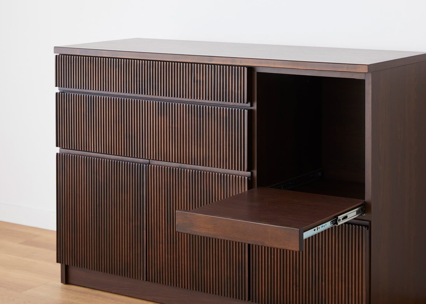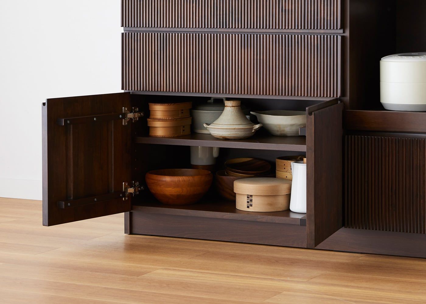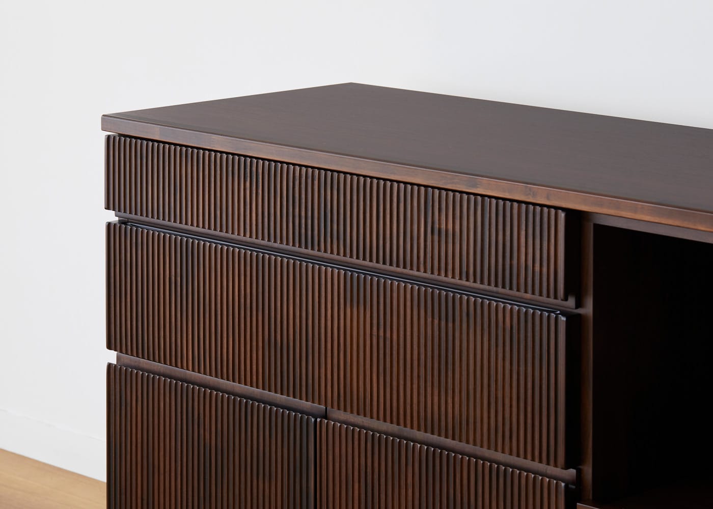 重厚感のあるダークブラウンと、無垢材に施した繊細な縦ラインによって高級感が漂います。収納力や機能性だけでは無く、デザイン性も求める方にお薦めです。