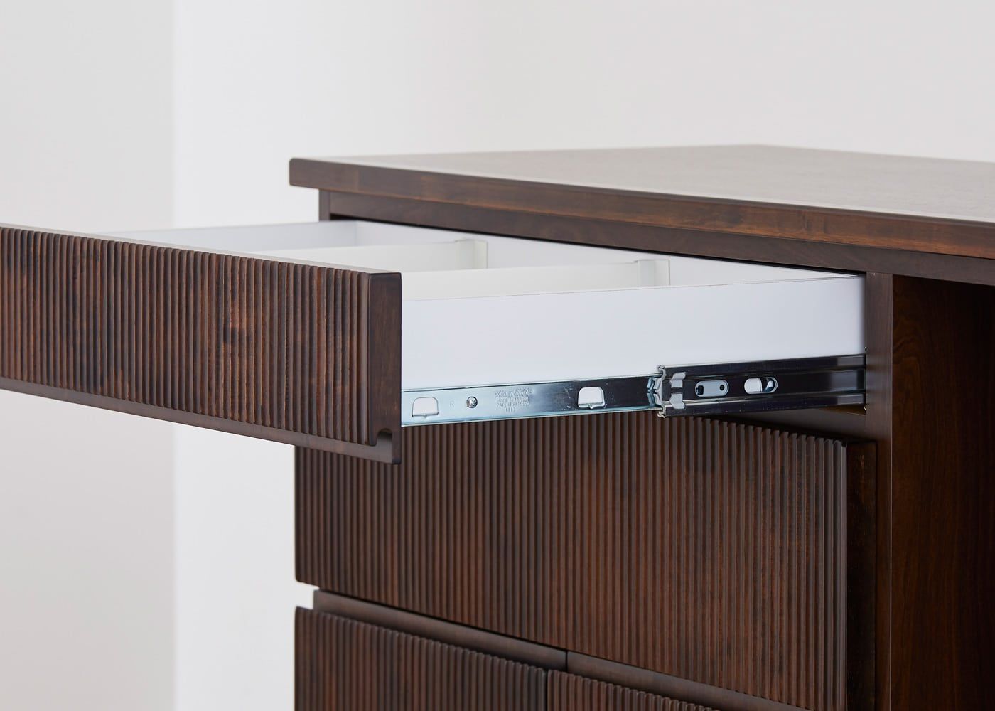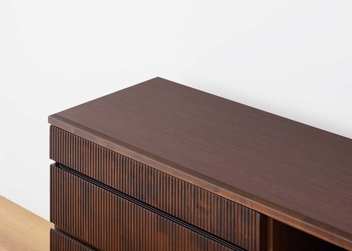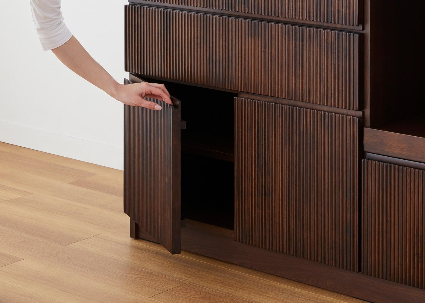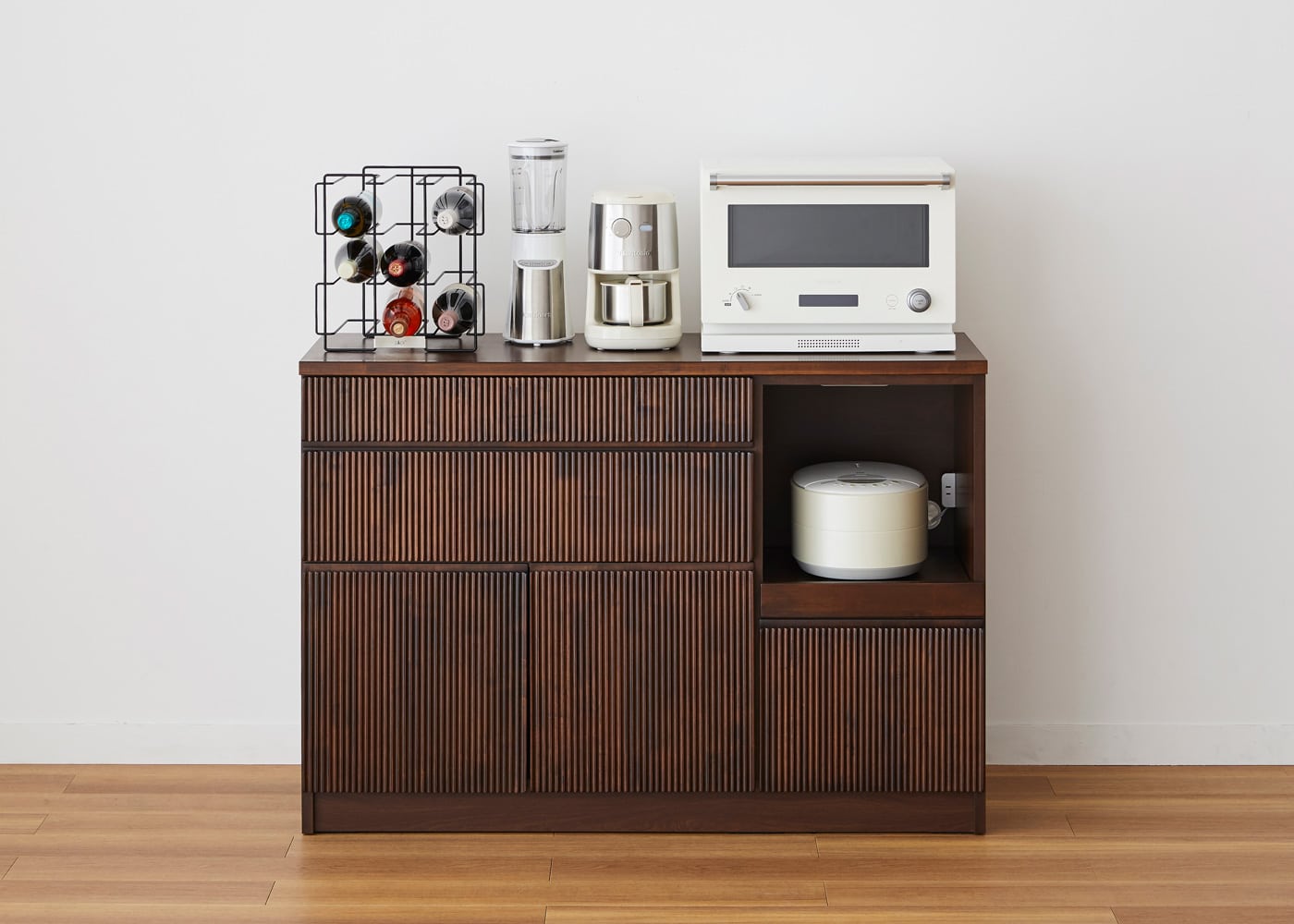 重厚感のあるダークブラウンと、無垢材に施した繊細な縦ラインによって高級感が漂います。収納力や機能性だけでは無く、デザイン性も求める方にお薦めです。