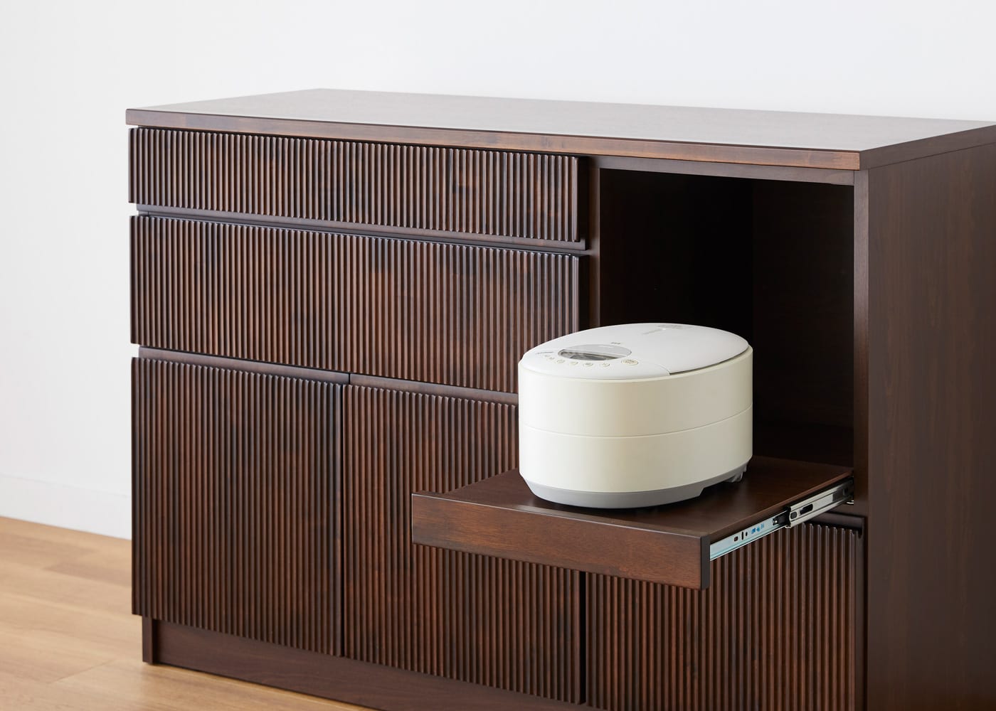 スライド収納スペースには、炊飯器やポットなどのキッチン家電を格納可能です。スライド棚を引き出してお使い頂くこともできます。(蒸気を逃す通気口付き)