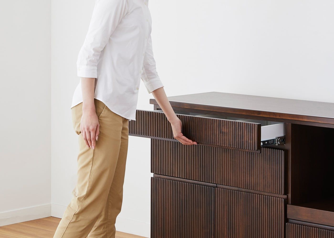 上段の引き出しは、下側の溝に指をかけて開くことができます。(モデルは身長167cmの女性)