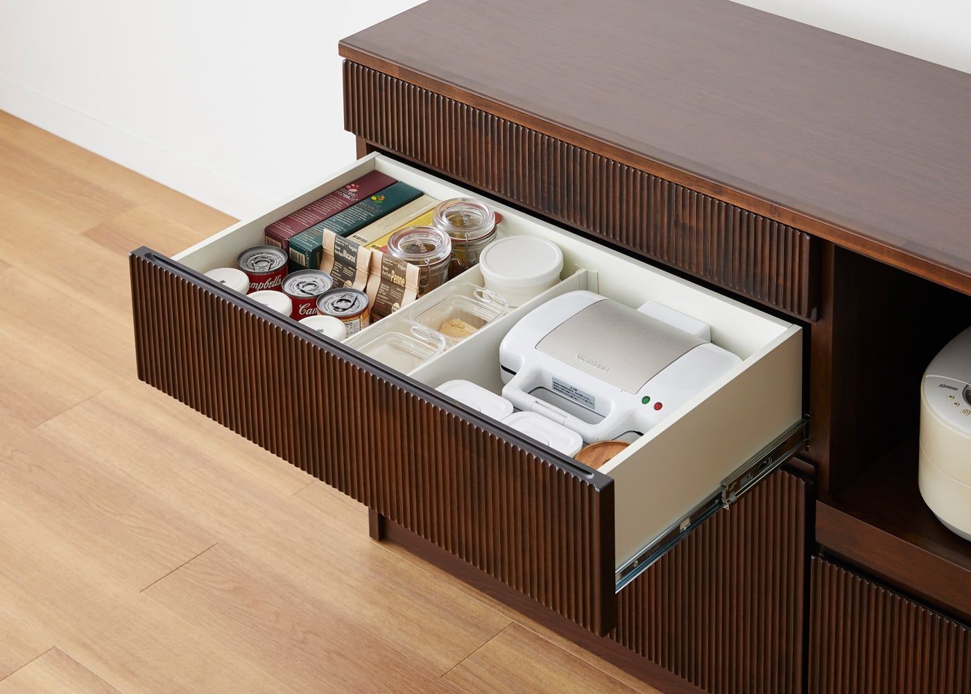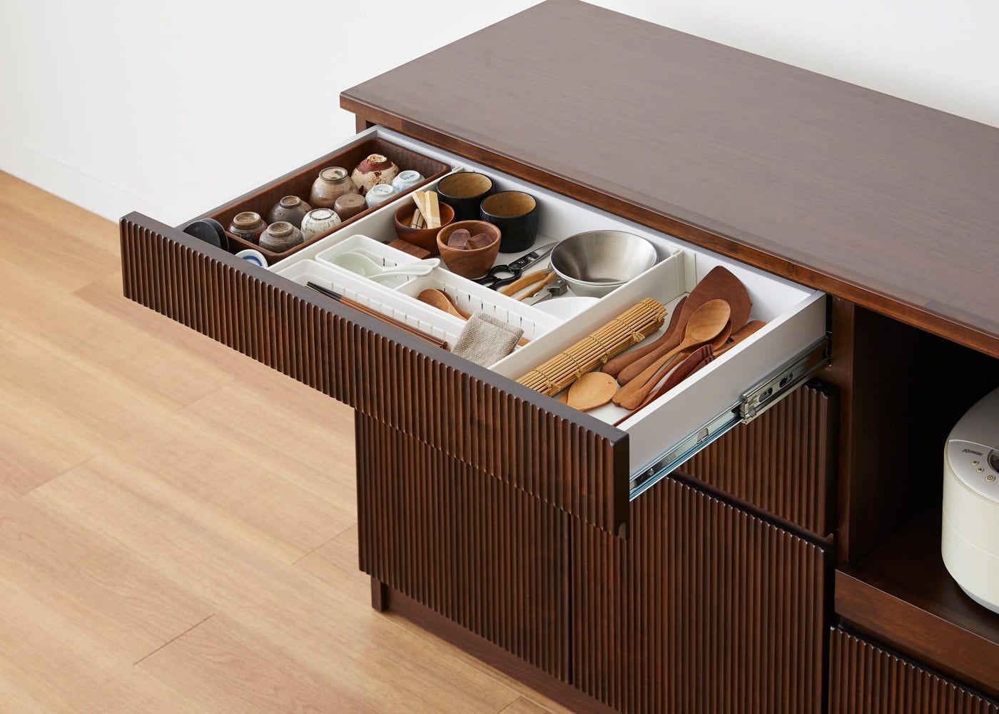 引き出しの1段目は深さ80mmです。カトラリーやコースター、箸置きなど細かいアイテムを収納できます。また、各引き出しには可動式の仕切り板を2枚ずつ付属しています。