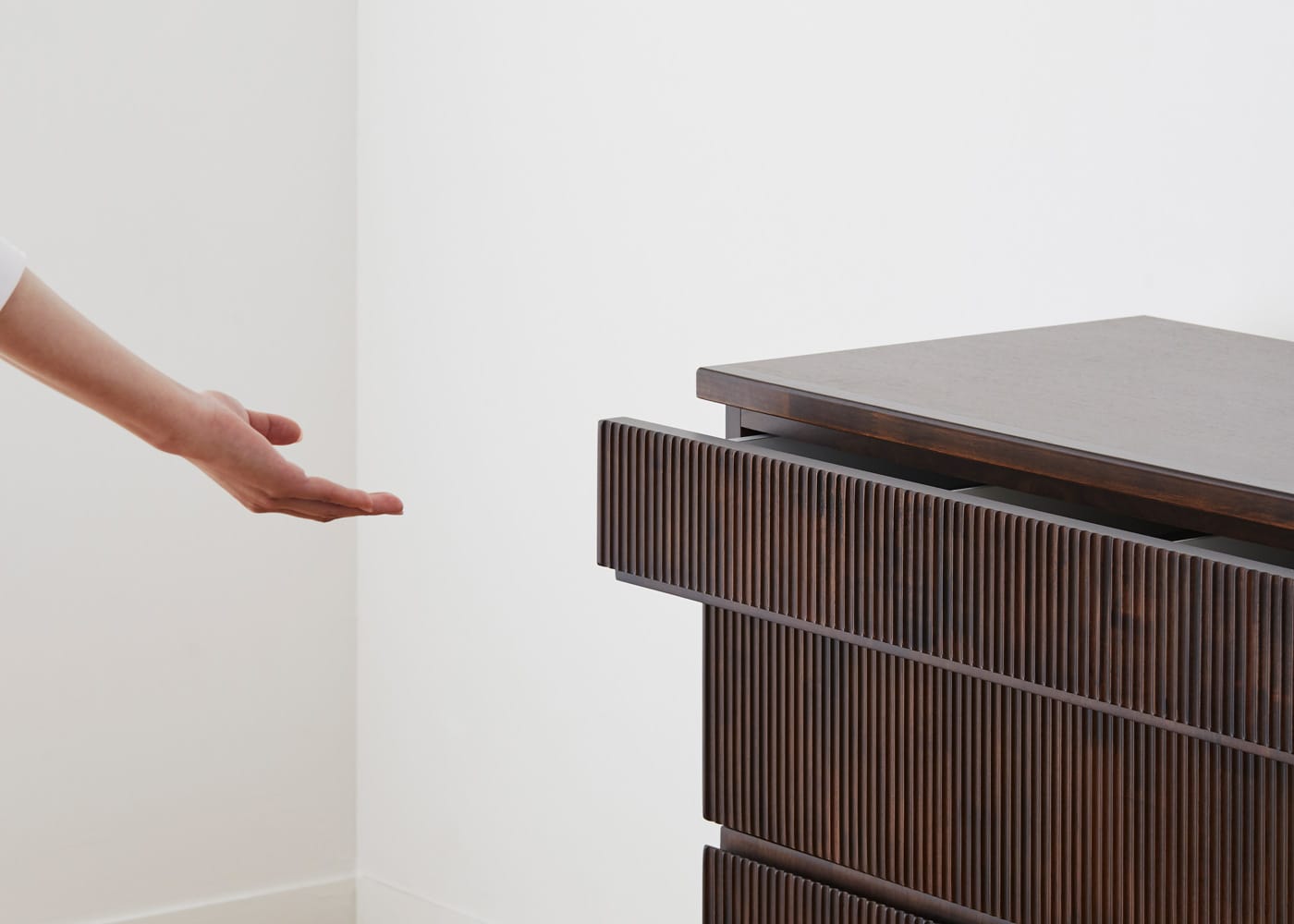 無数の線と溝が描く曲面の一つ一つに光が反射することで、レンシリーズ独特の光沢や陰影が生まれます。伝統技法の「なぐり加工」によって無垢材から無数の溝を削り出し、職人が一本一本の溝を丁寧に研磨することで美しい曲面が完成します。シンプルであるからこそ、細部の美しさにこだわりました。
