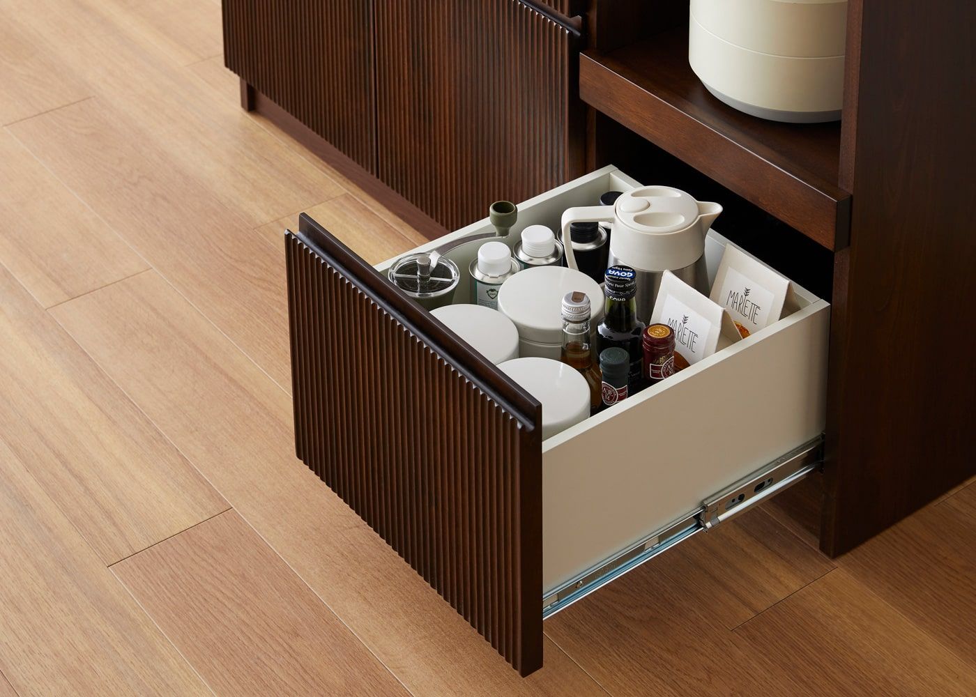引き出しには、使い勝手を考えたソフトクローズシステムを採用。閉まる直前に減速して、静かにゆっくりと閉まります。