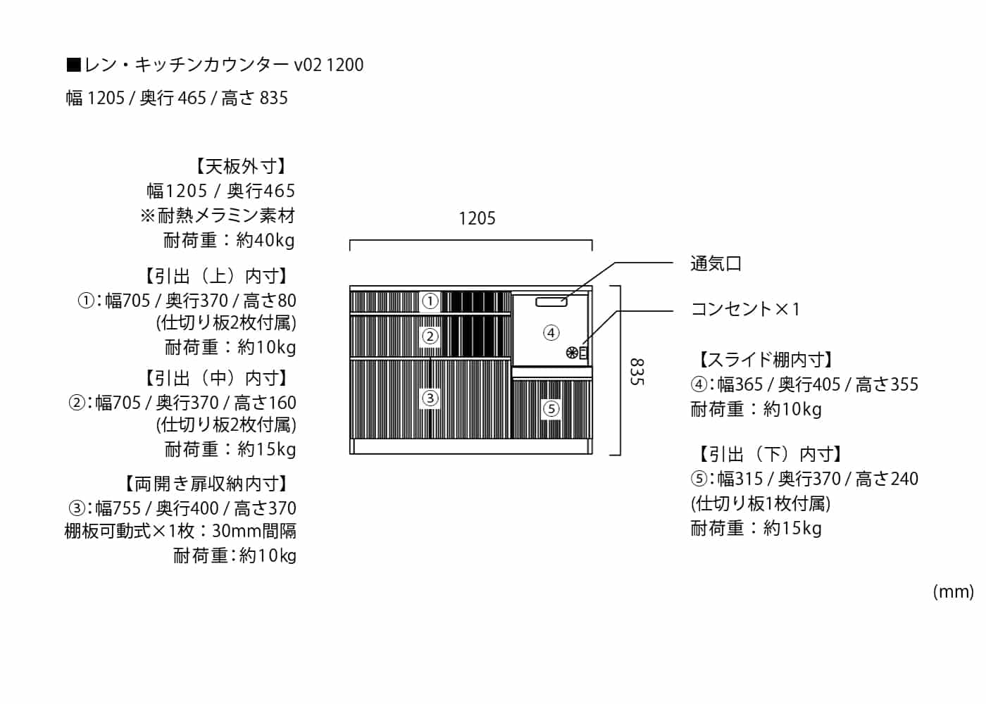 幅1205 / 奥行465 / 高さ835 ※単位は mm
