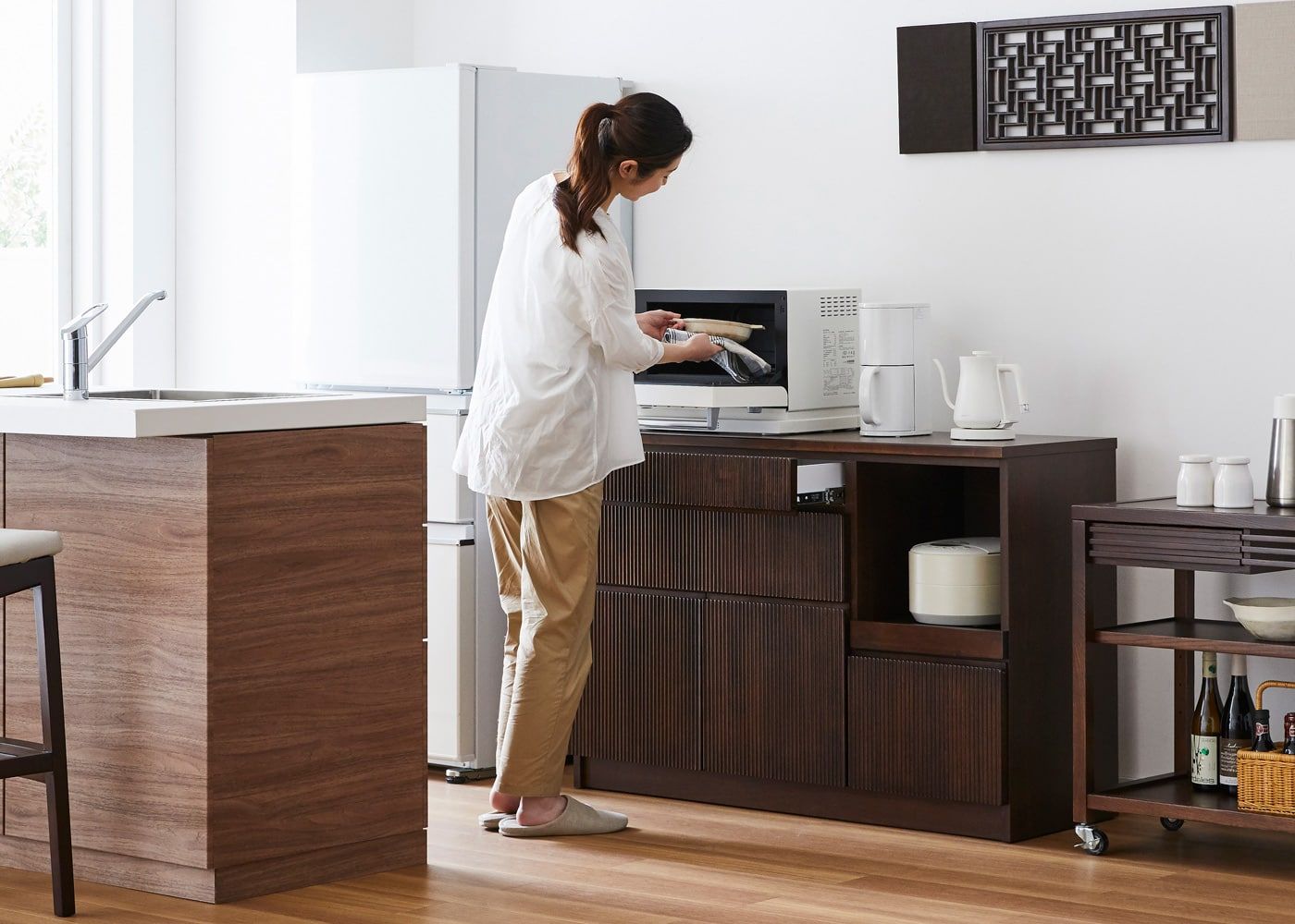デザイン性に加えて、便利な収納力と機能性を併せ持ったキッチンカウンターです。毎日の暮らしに欠かせない料理の時間、キッチンで過ごす時間を楽しく過ごせます。(モデルは身長167cmの女性)
