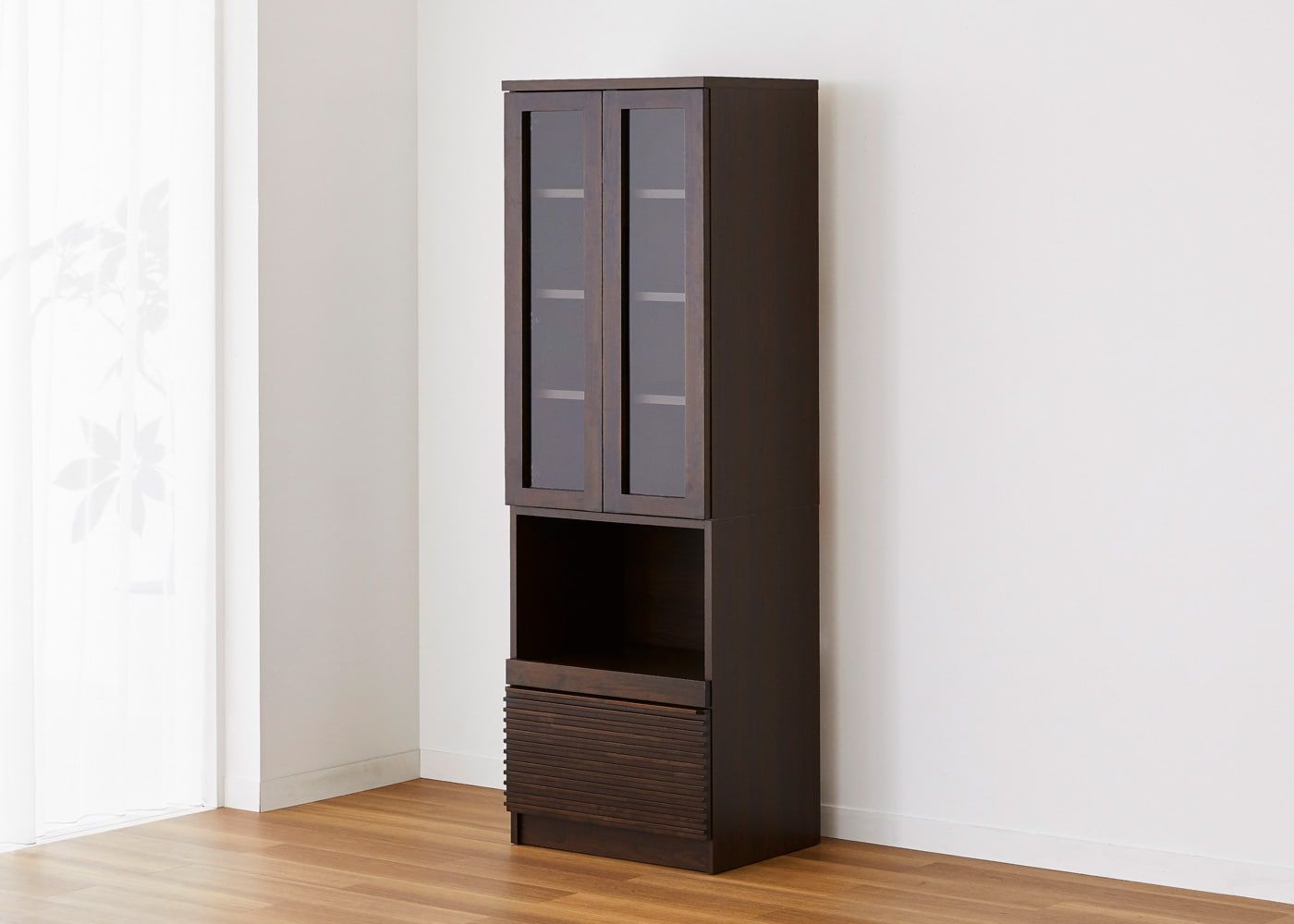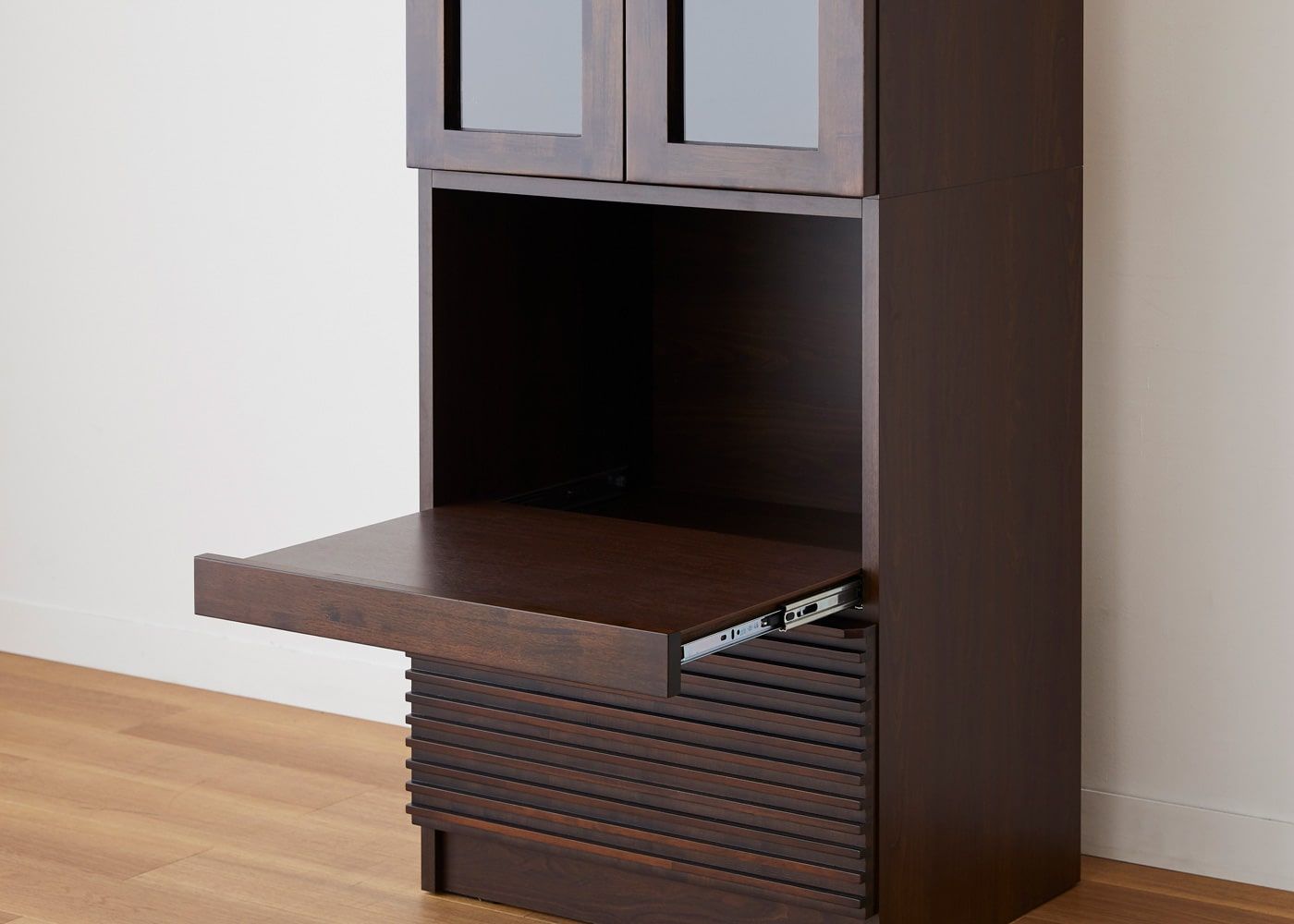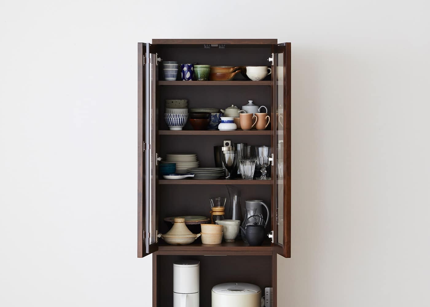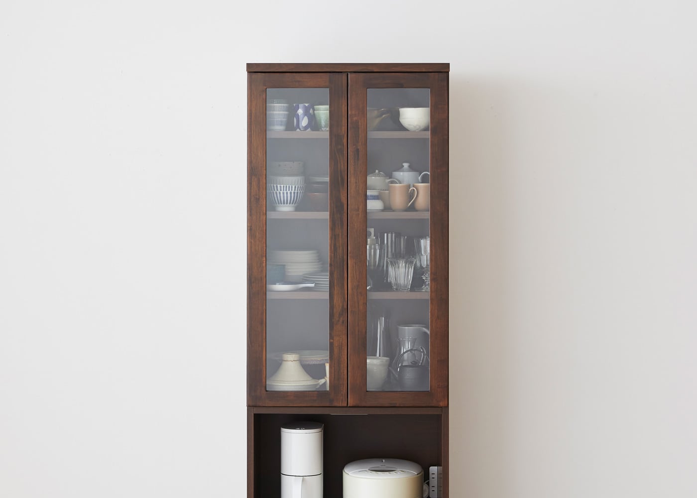 上段のガラス扉収納はショーケースのように、「魅せる収納」として活用もできます。お気に入りの食器類などを飾ってみては?