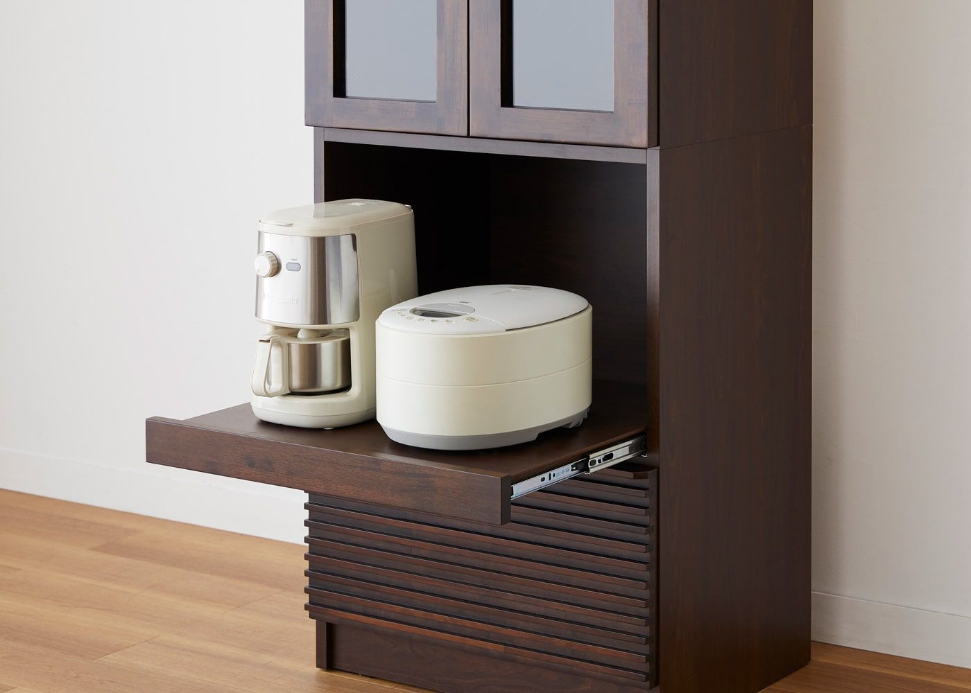 スライド収納スペースには、コーヒーメーカーや炊飯器などのキッチン家電を格納可能。スライド棚を引き出してお使い頂けるため熱や蒸気なども安心です。