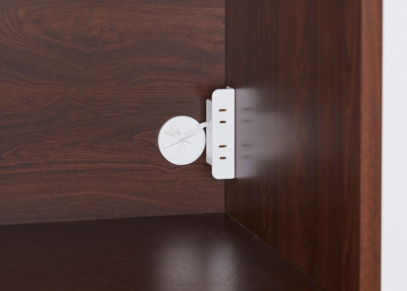 ガラス扉の内側にはホコリの侵入を防ぐバーを付けて、ガラス扉内を清潔に保つよう工夫されています。また、ガラス扉には耐震ラッチがついており、大きな揺れを感知すると扉をロック、食器類の落下を防ぎます。更に家具の転倒を防ぐ、転倒防止補助バンドも付属。安全性にも配慮したキッチン収納です。