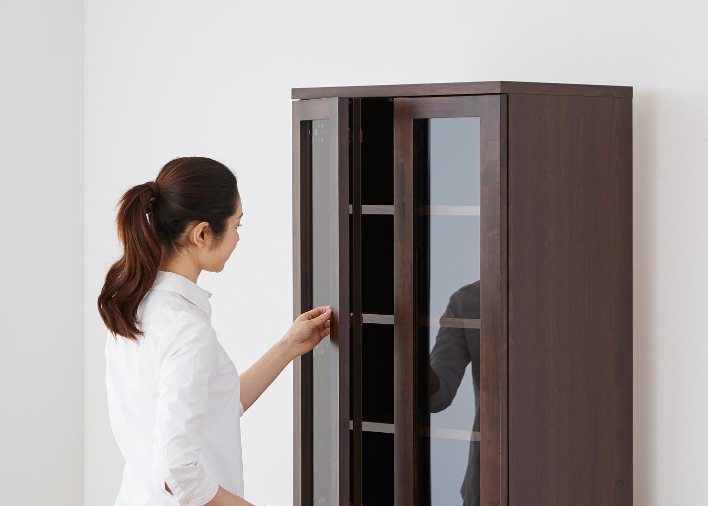 上段のガラス扉は、木枠フレームの内側に指を掛けて開くことができます。また、オートヒンジを採用しているため、左右どちら側からでも扉の開閉が可能です。(モデルは身長167cmの女性)