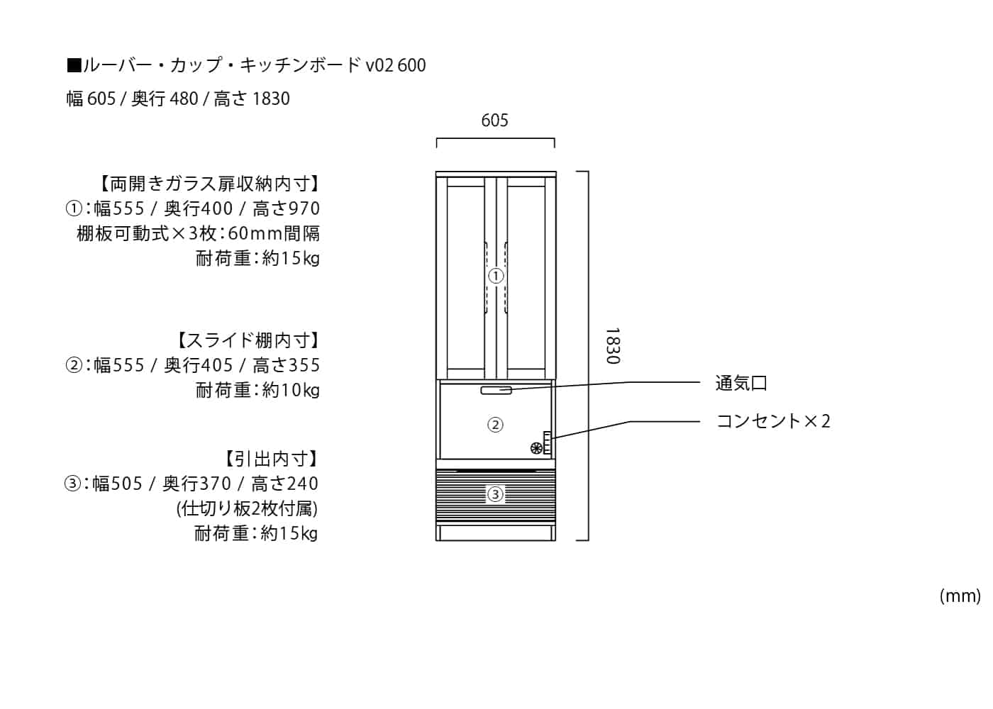 幅605 / 奥行480 / 高さ1830 ※単位は mm