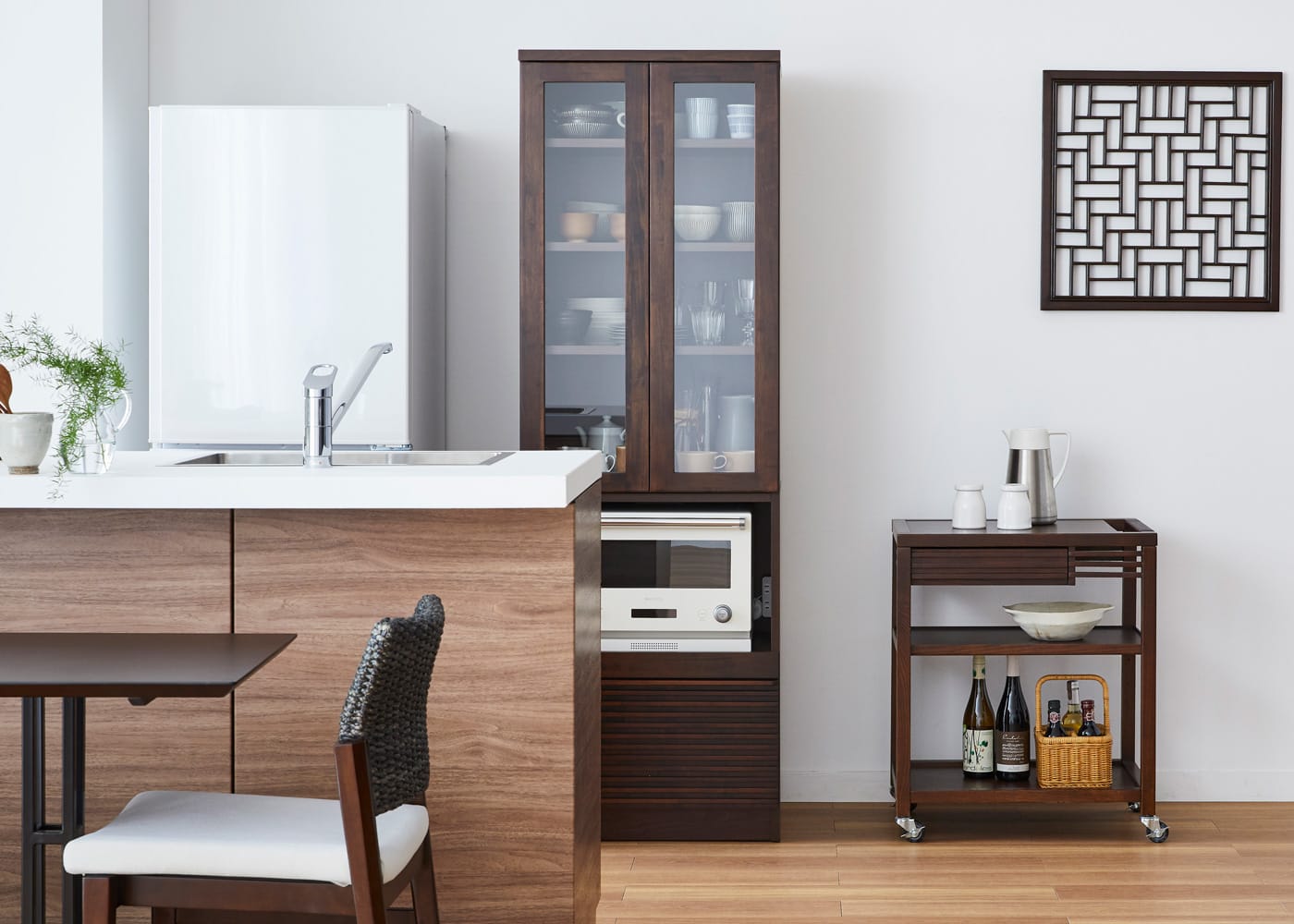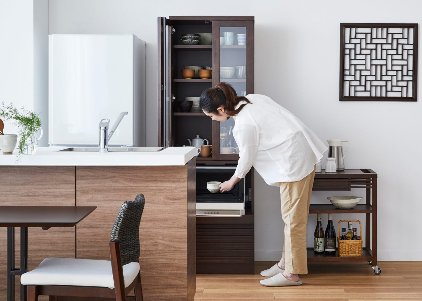 デザイン性に加えて、コンパクトながらも上段・下段に豊富な収納スペースを兼ね備えたカップ・キッチンボードです。毎日の暮らしに欠かせない料理の時間、キッチンで過ごす時間を楽しく過ごせます。(モデルは身長167cmの女性)