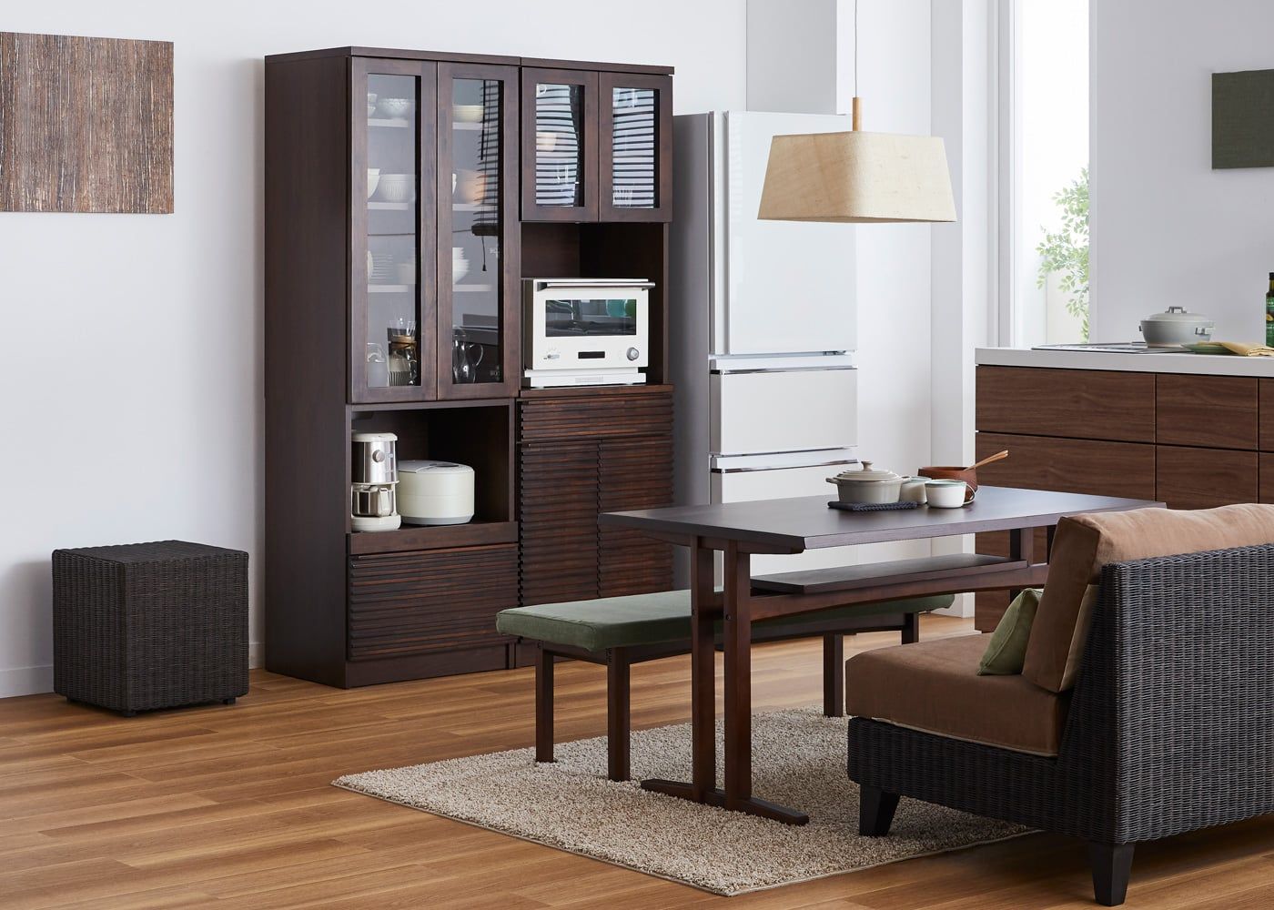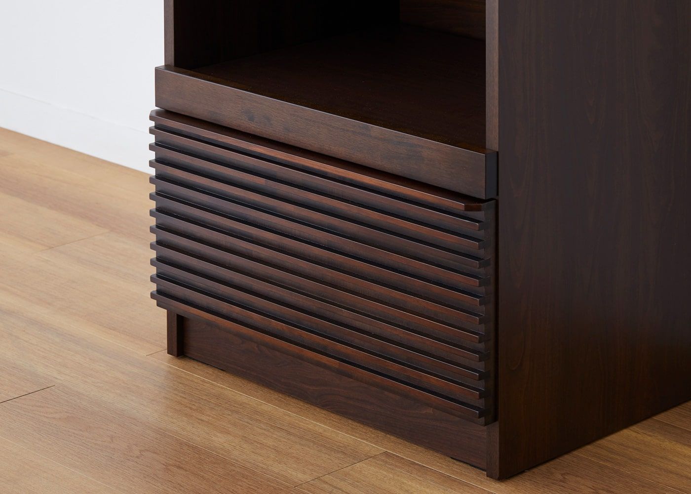 重厚感のあるダークブラウンと、無垢材を用いた水平ラインによって洗練感が漂います。収納力や機能性だけでは無く、デザイン性も求める方にお薦めです。