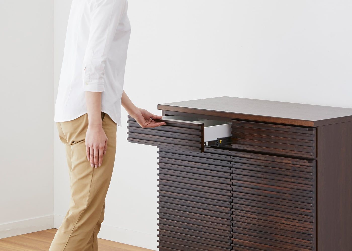 引き出しは、前板の上にある取っ手に指をかけて引き出せます。(モデルは身長167cmの女性)