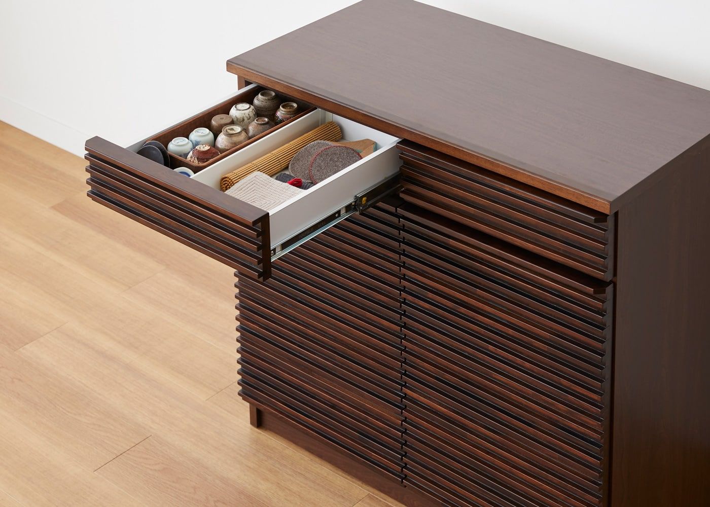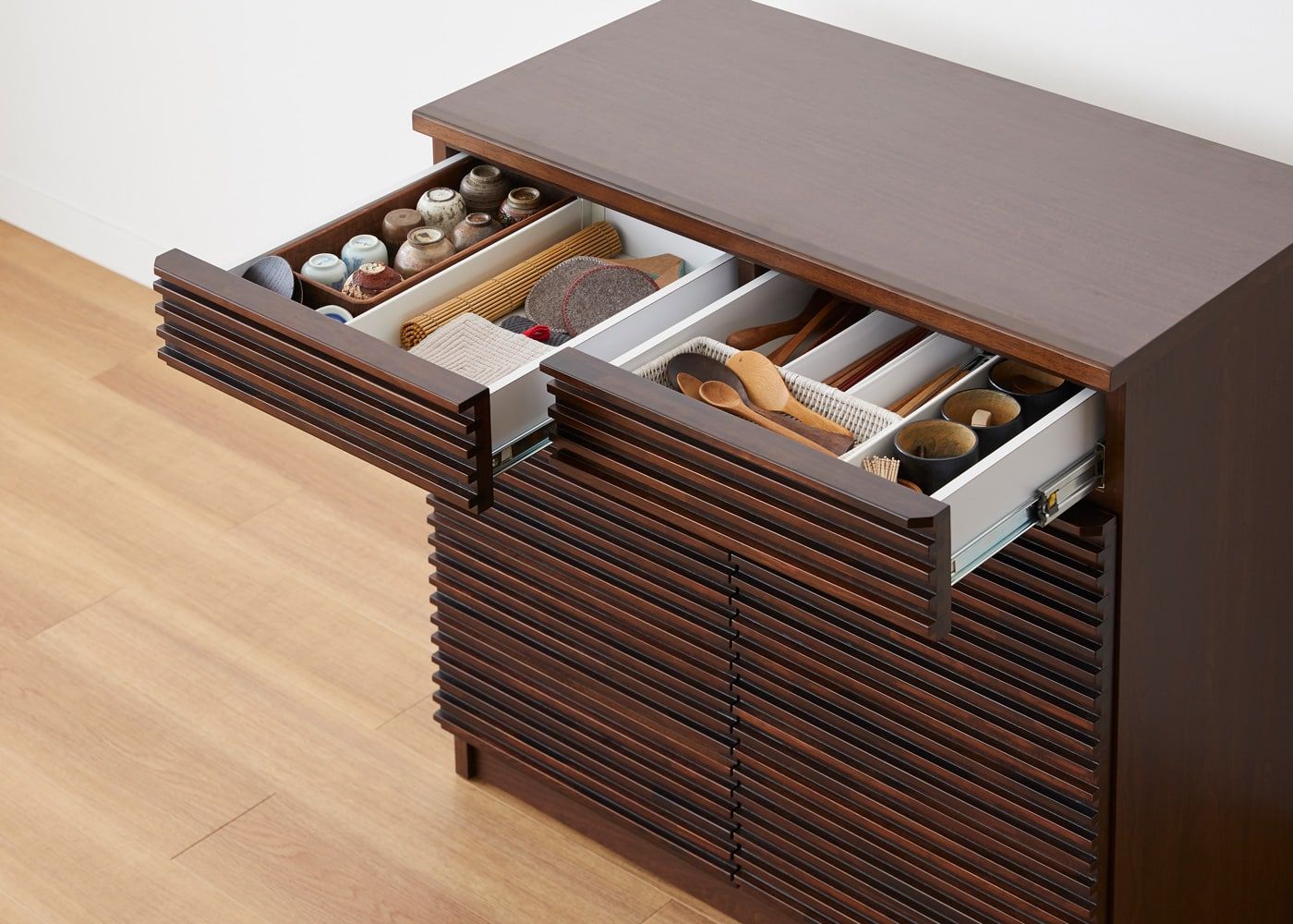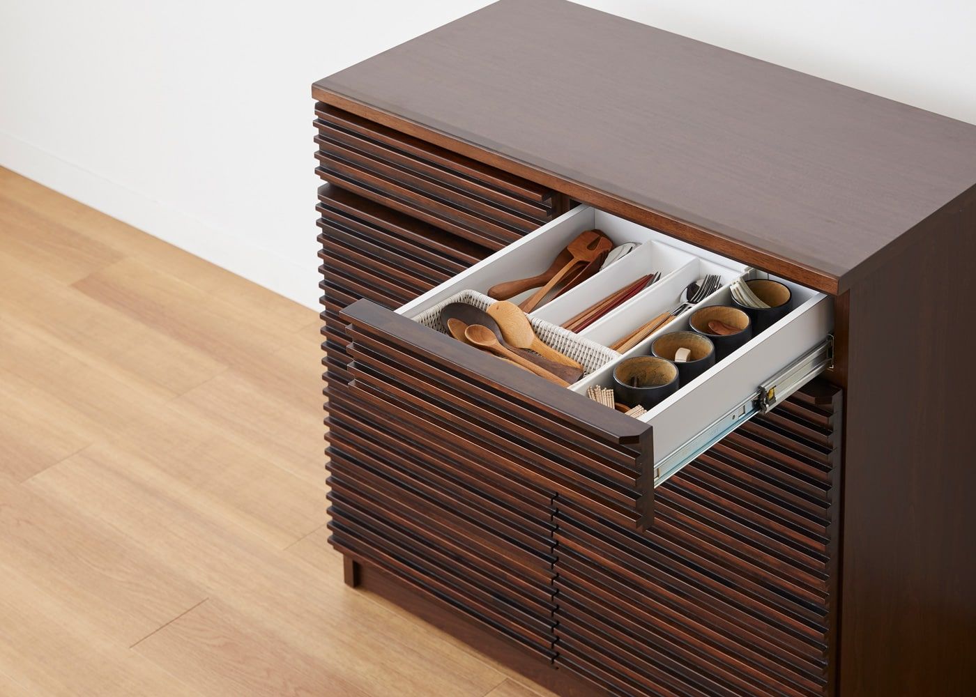 引き出しの深さは65mmです。カトラリーやコースター、箸置きなど細かいアイテムを収納できます。また、引き出しには可動式の仕切り板を1枚付属しています。