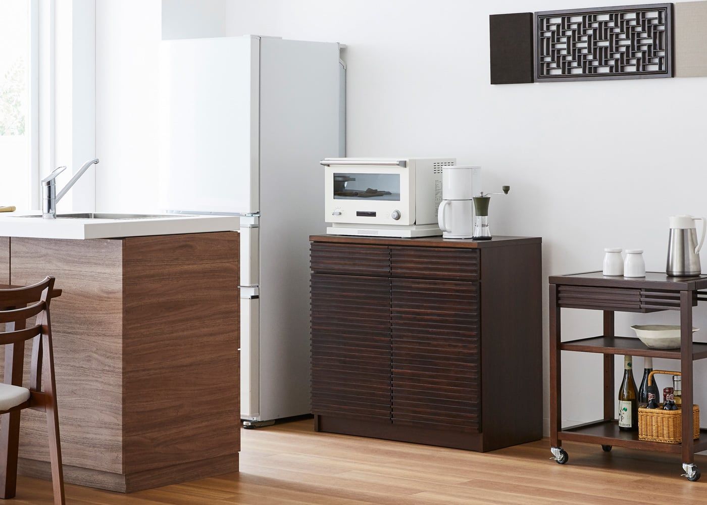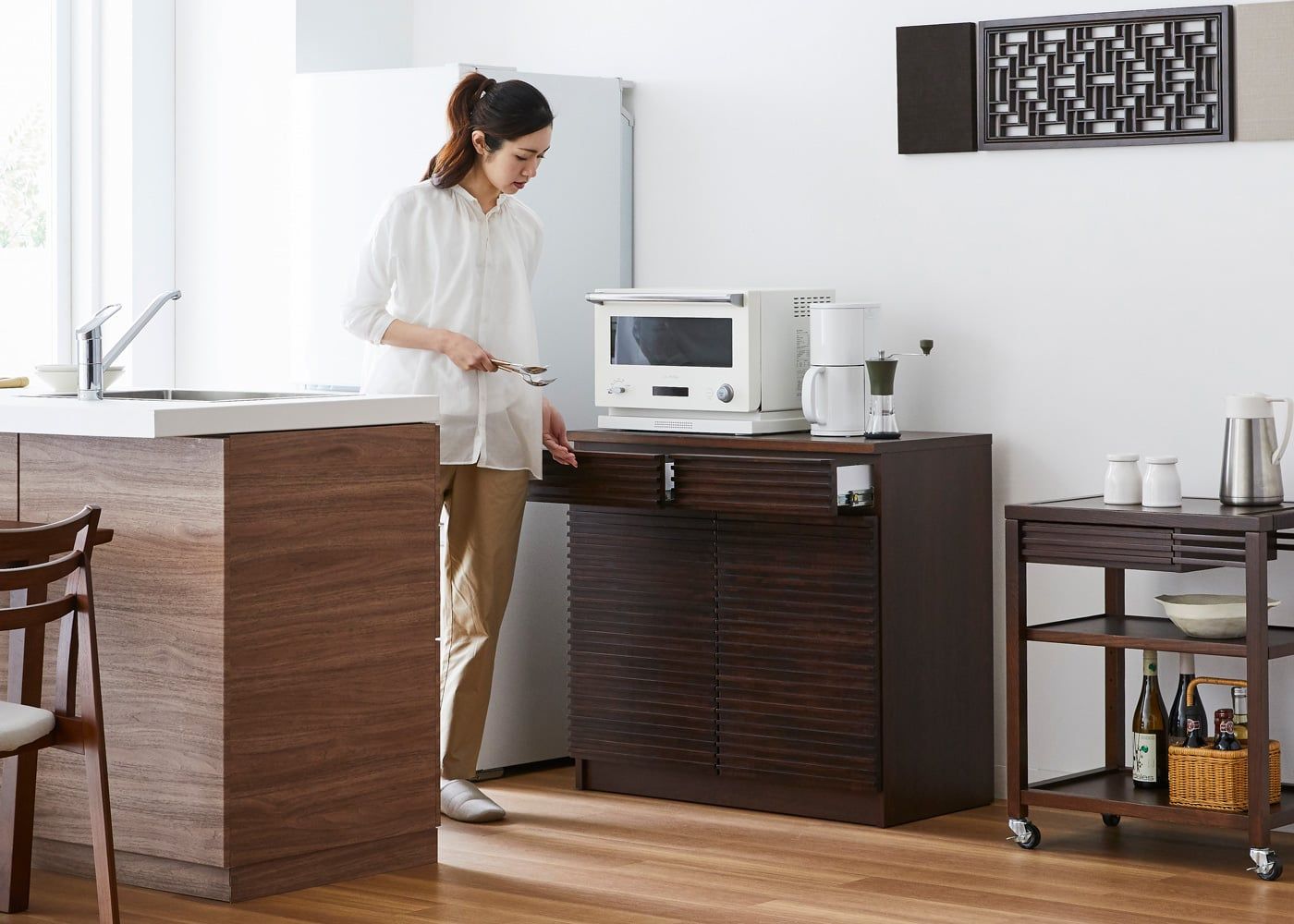 ルーバー・カップカウンターv02 870はデザイン性だけでは無く、充実した収納力も魅力です。天板上のスペースには、電子レンジやコーヒーメーカー、ミキサーなどのキッチン家電を数点並べて配置できます。