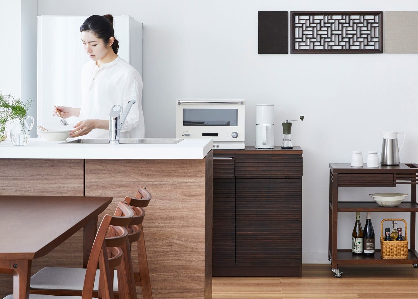 デザイン性に加えて、便利な収納力と機能性を兼ね備えたカップカウンターです。毎日の暮らしに欠かせない料理の時間、キッチンで過ごす時間を楽しく過ごせます。(モデルは身長167cmの女性)