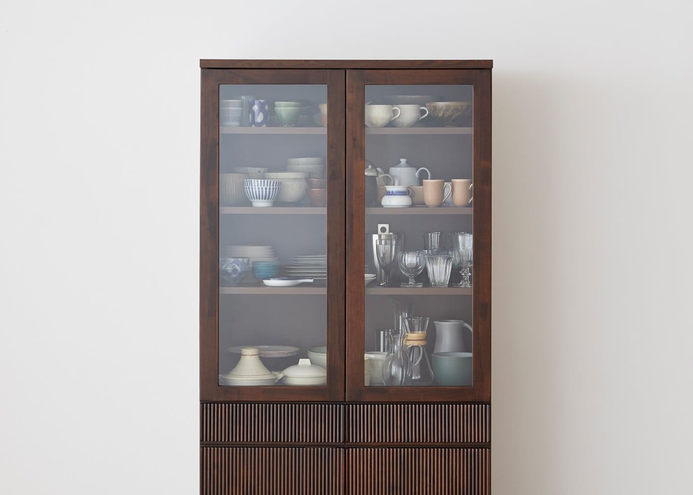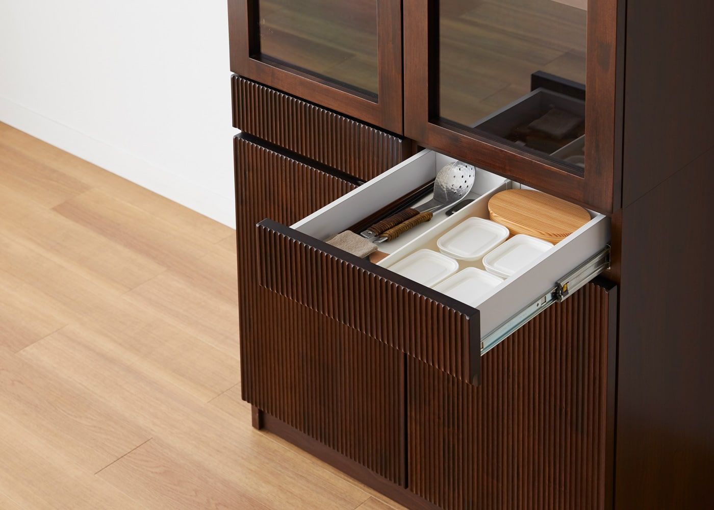 上段・下段に大容量の収納スペースがあり、キッチン周りのアイテムをたっぷり収納できます。上段のガラス扉収納はショーケースのように、「魅せる収納」として活用いただくことも可能です。