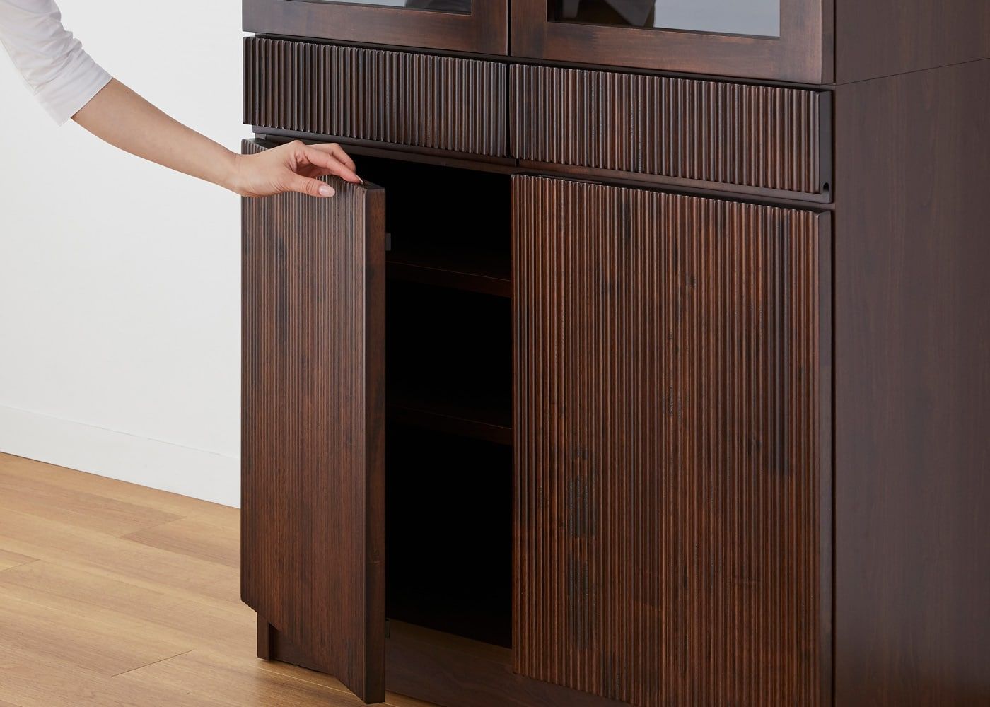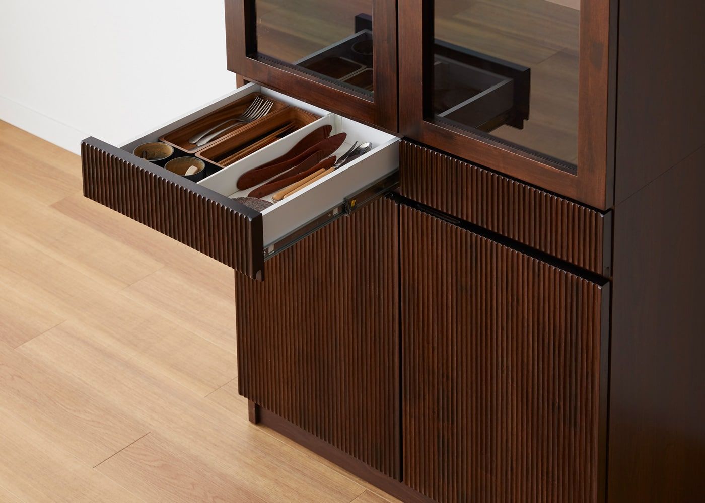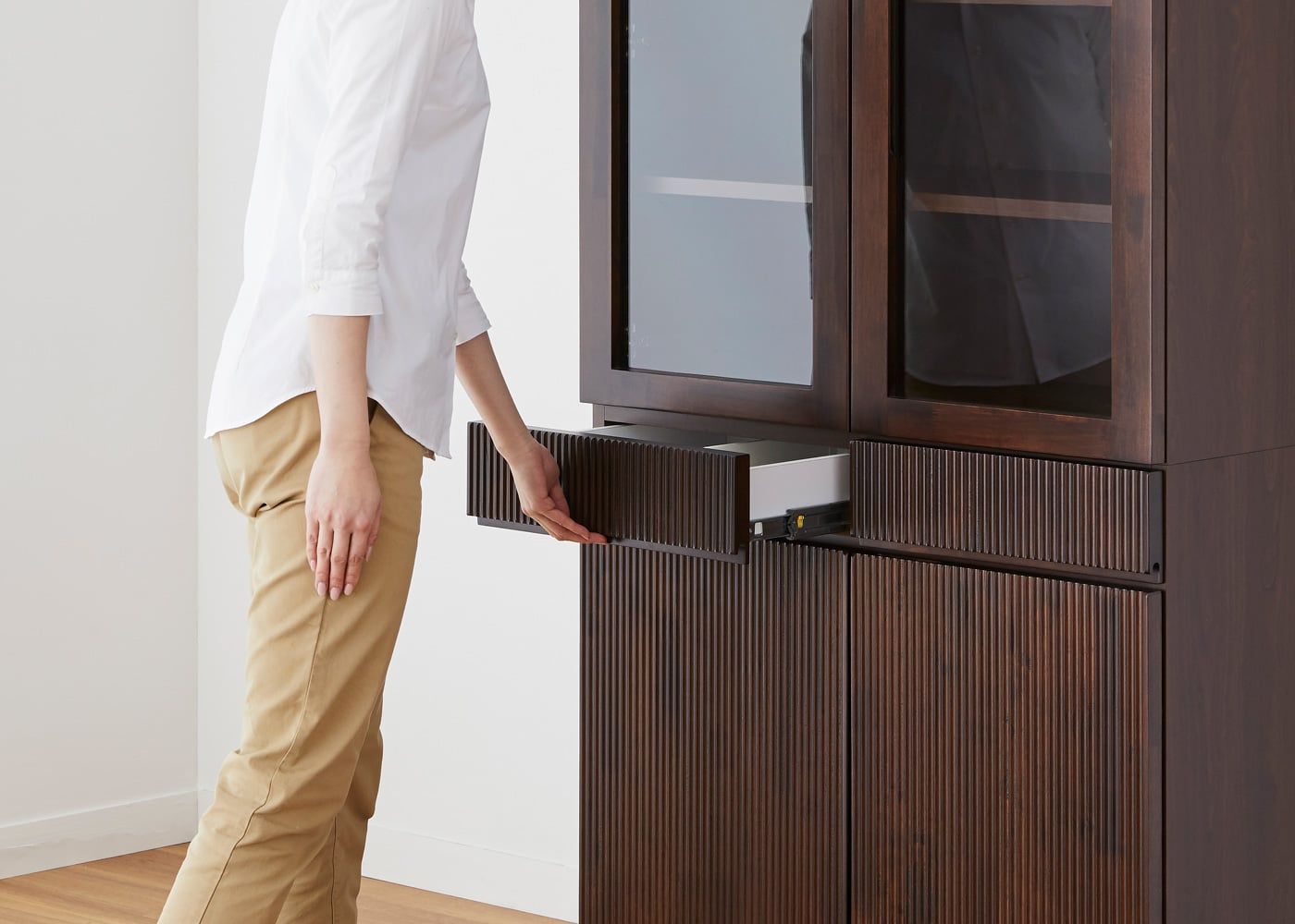 重厚感のあるダークブラウンと、無垢材に施した繊細な縦ラインによって高級感が漂います。収納力や機能性だけでは無く、デザイン性も求める方にお薦めです。
