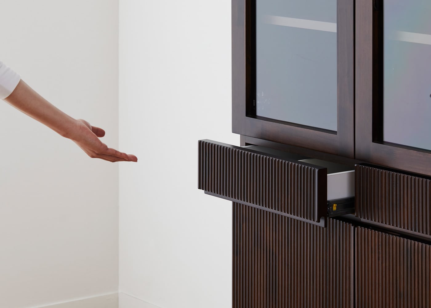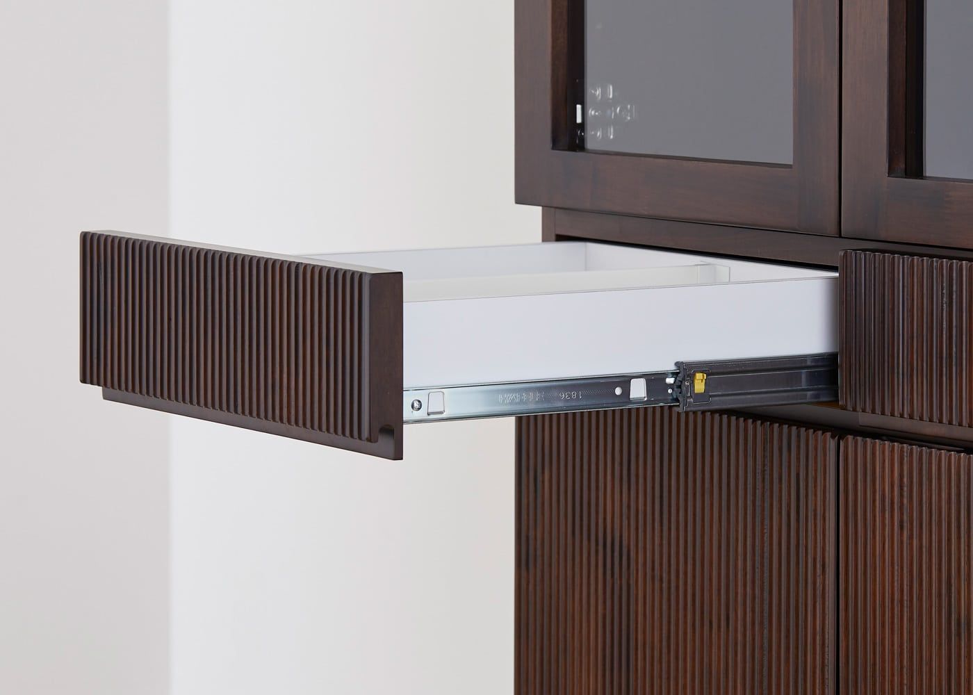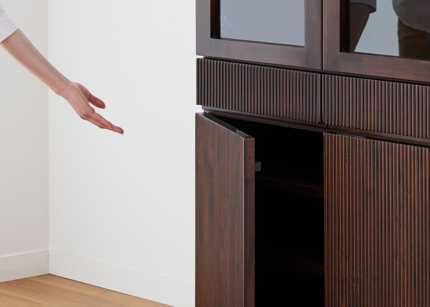 絶え間なく流れる幾筋もの滝から着想を得たデザインが人の心を惹き付ける、レン・カップボードv02 870。どこまでも連なる縦ラインがシンプルな中にもどこか美しさを感じさせます。