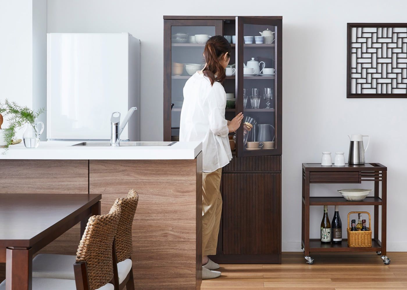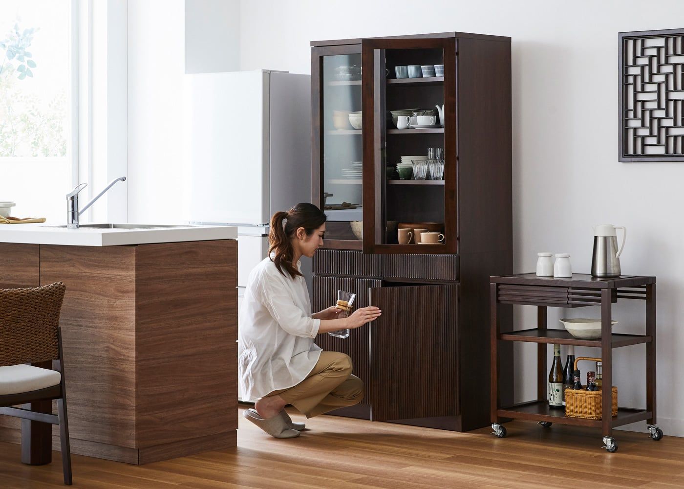 カップボードの高さは1830mm、女性でも手が届く使いやすさを考慮した設計です。お気に入りの食器やグラス類などをたっぷり収納できます。(モデルは身長167cmの女性、冷蔵庫のサイズは幅600mm / 高さ1700mm)