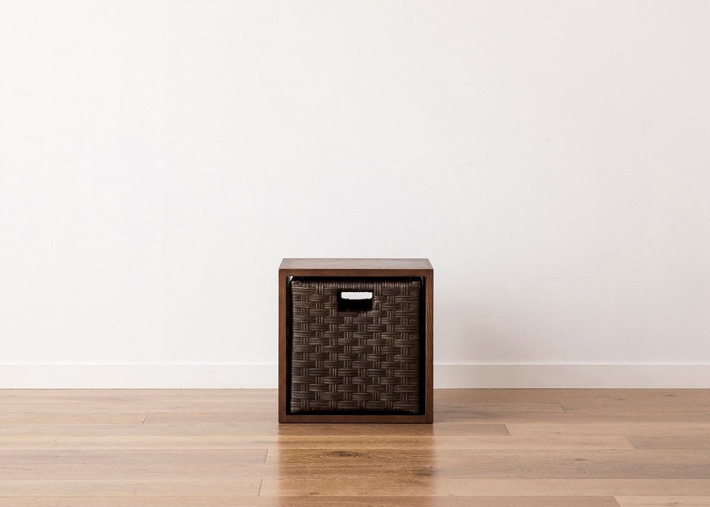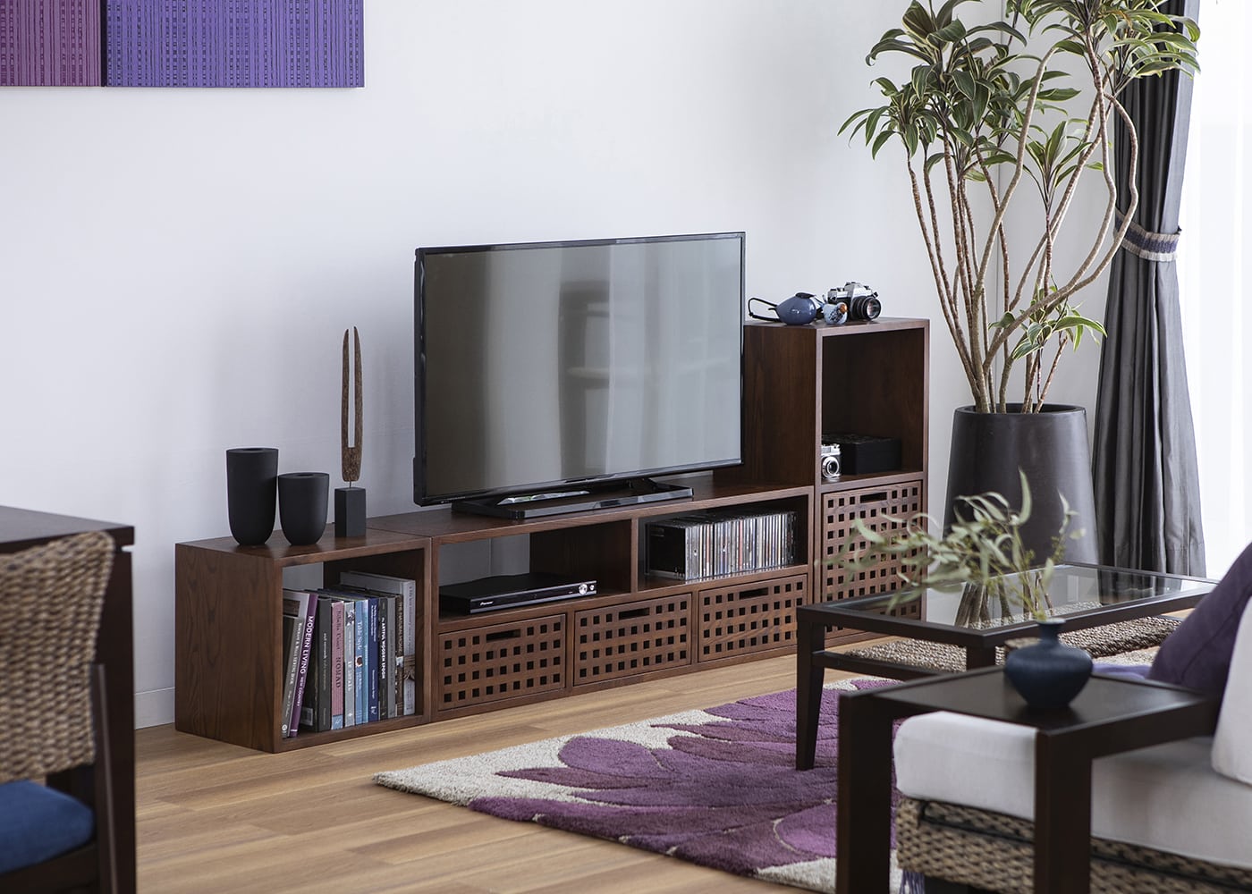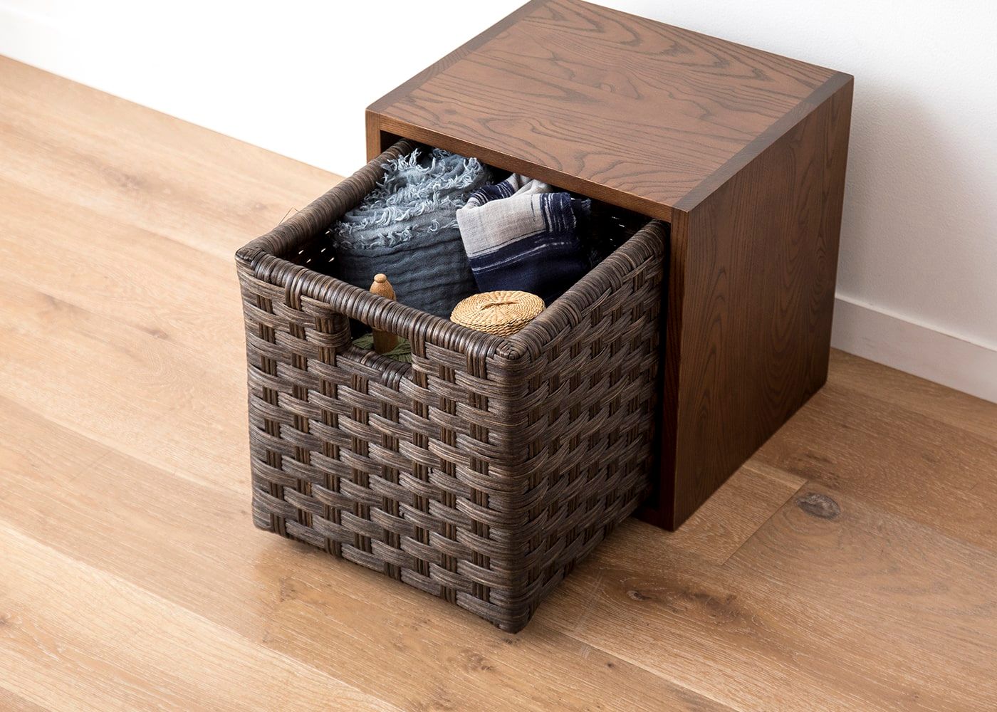 棚部分にドロワーを追加すると引出収納としても使えます。格子デザインとフレームデザインの2種類の表情が楽しめるリバーシブル仕様のウッド・ドロワーと、職人の手作業による繊細な編み目が魅力のラタン・ドロワーをご用意。お部屋の雰囲気に合わせてドロワーが選べます。(ドロワーは別売り、写真は一例です)