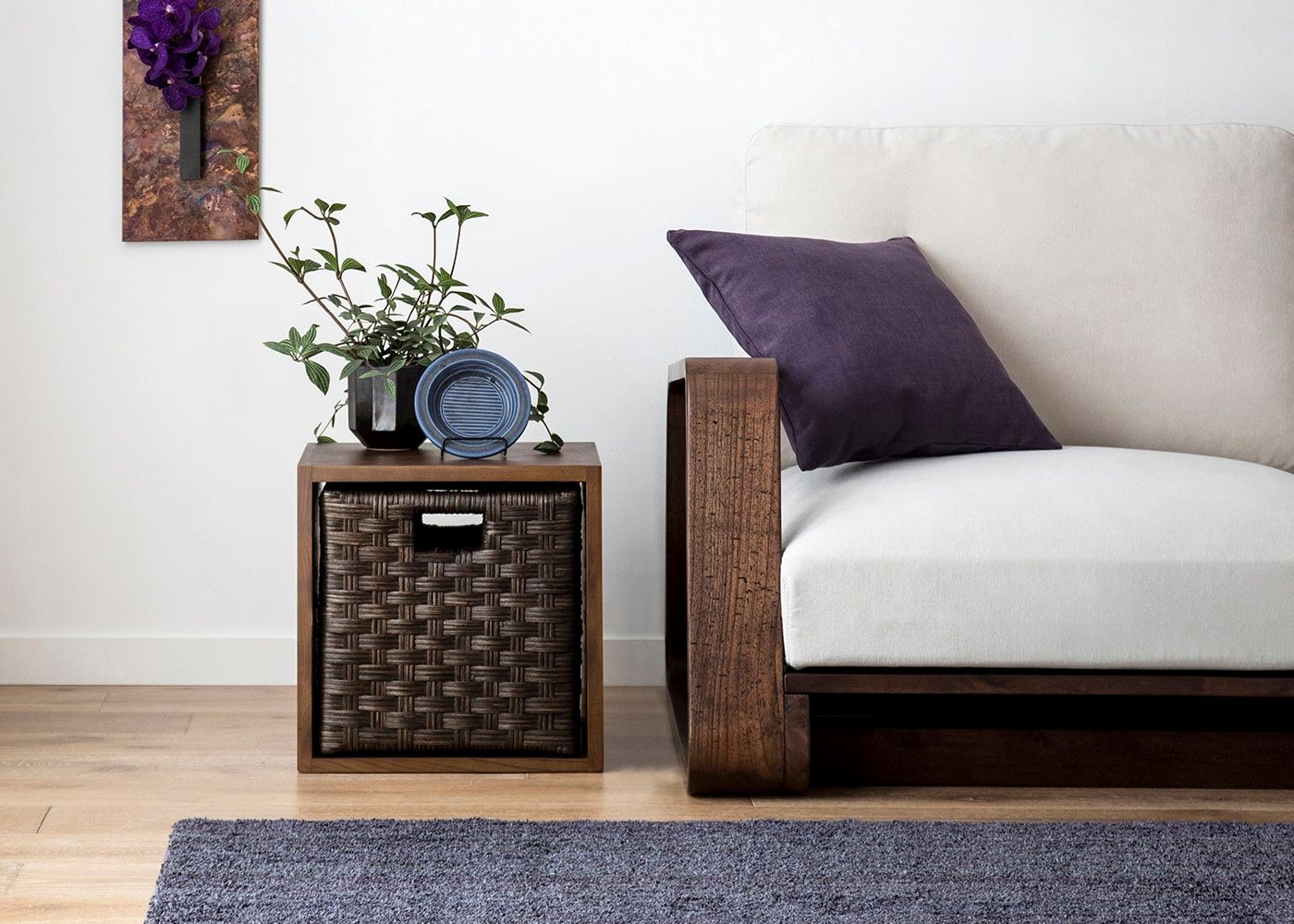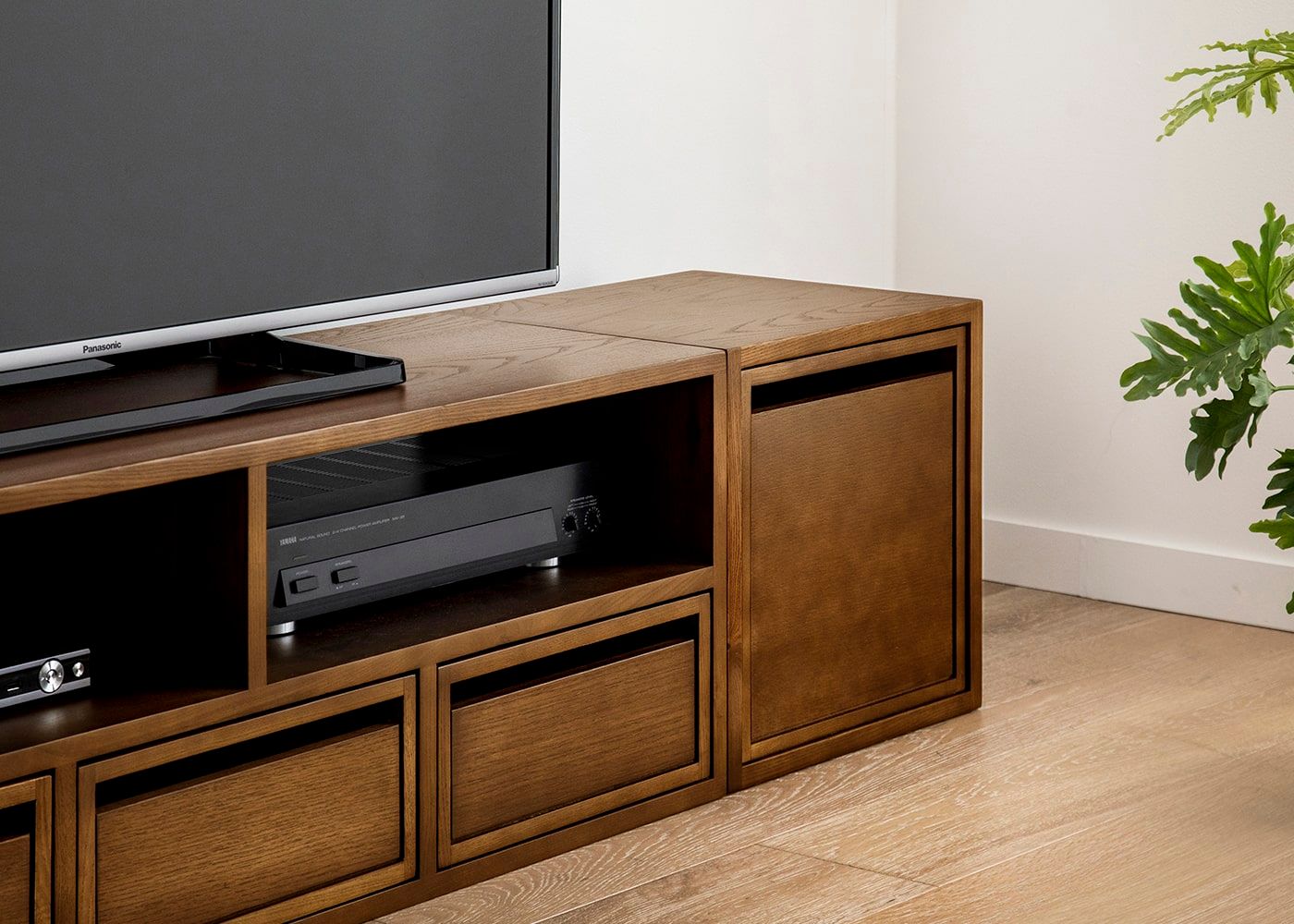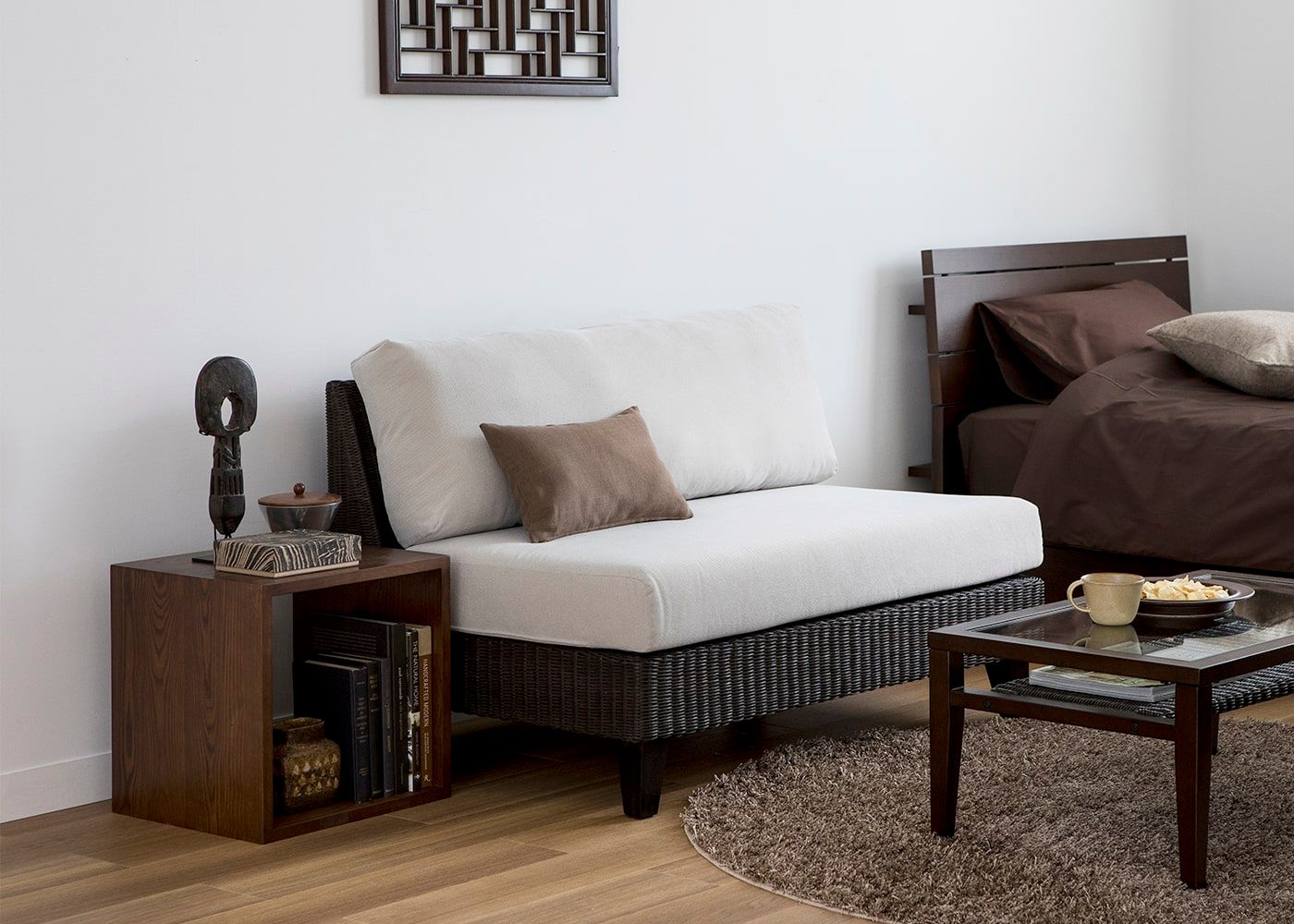 棚部分にドロワーを追加すると引出収納としても使えます。格子デザインとフレームデザインの2種類の表情が楽しめるリバーシブル仕様のウッド・ドロワーと、職人の手作業による繊細な編み目が魅力のラタン・ドロワーをご用意。お部屋の雰囲気に合わせてドロワーが選べます。(ドロワーは別売り、写真は一例です)