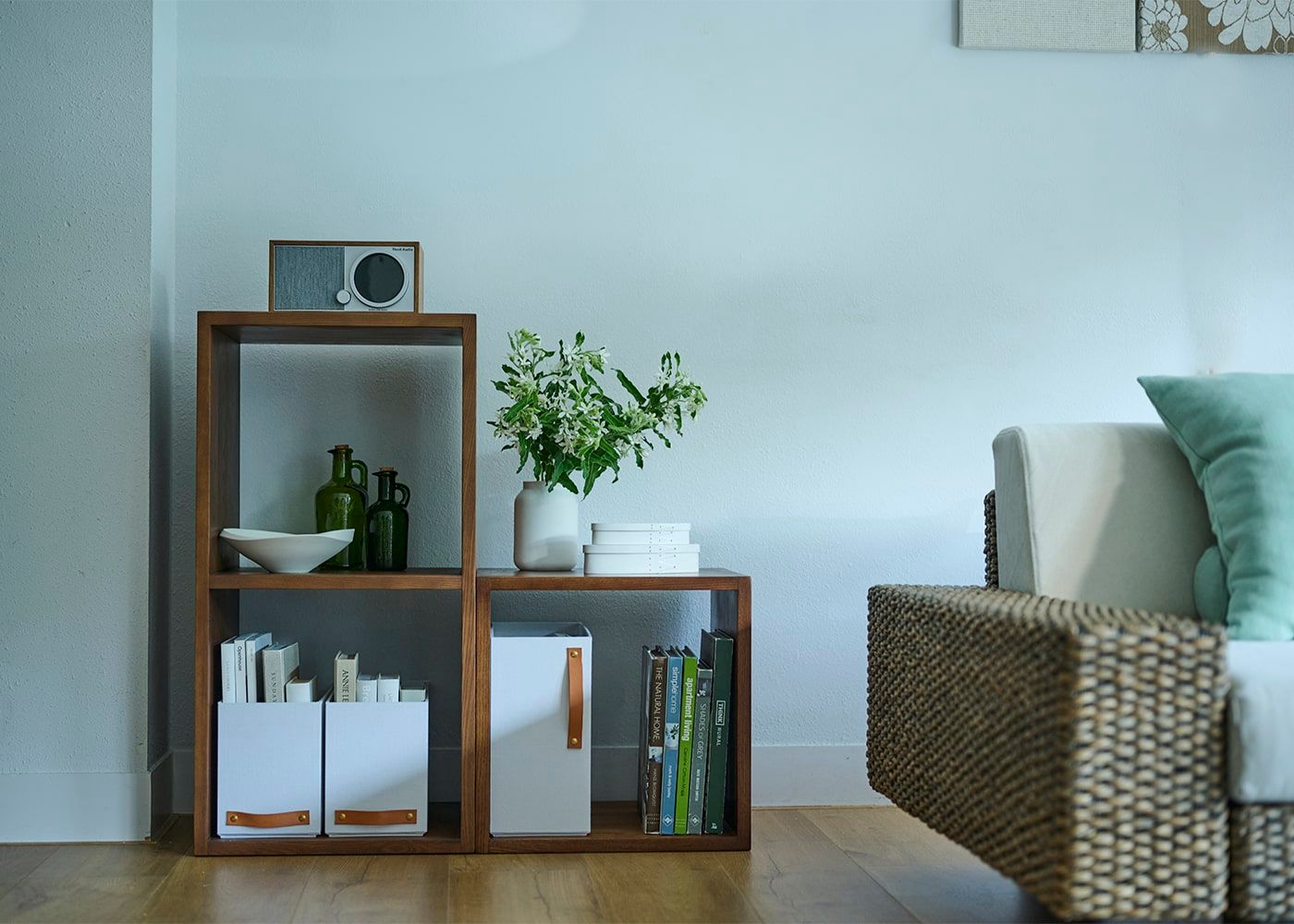 統一されたモジュールにより、収納棚の組み合わせ次第で自分に合ったサイズやデザインの収納棚が作れます。ライフスタイルに合わせて自由に形を変えて長く使い続けられる収納シリーズです。(写真は一例です)
