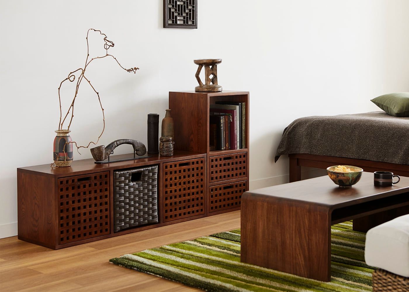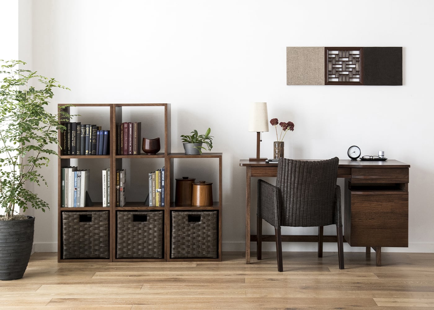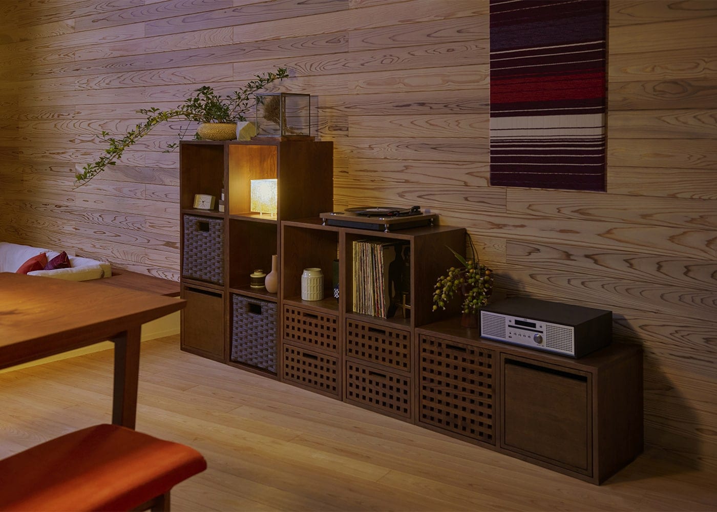 収納棚にドロワーを追加すると収納力があがるのはもちろん、ラタンの編み目そのものがデザインになった素材感が楽しめる収納棚に。ドロワーは棚部分に差し込むだけの簡単な構造なので、好きな位置にドロワーを入れることができます。(収納棚は別売り、写真は一例です)