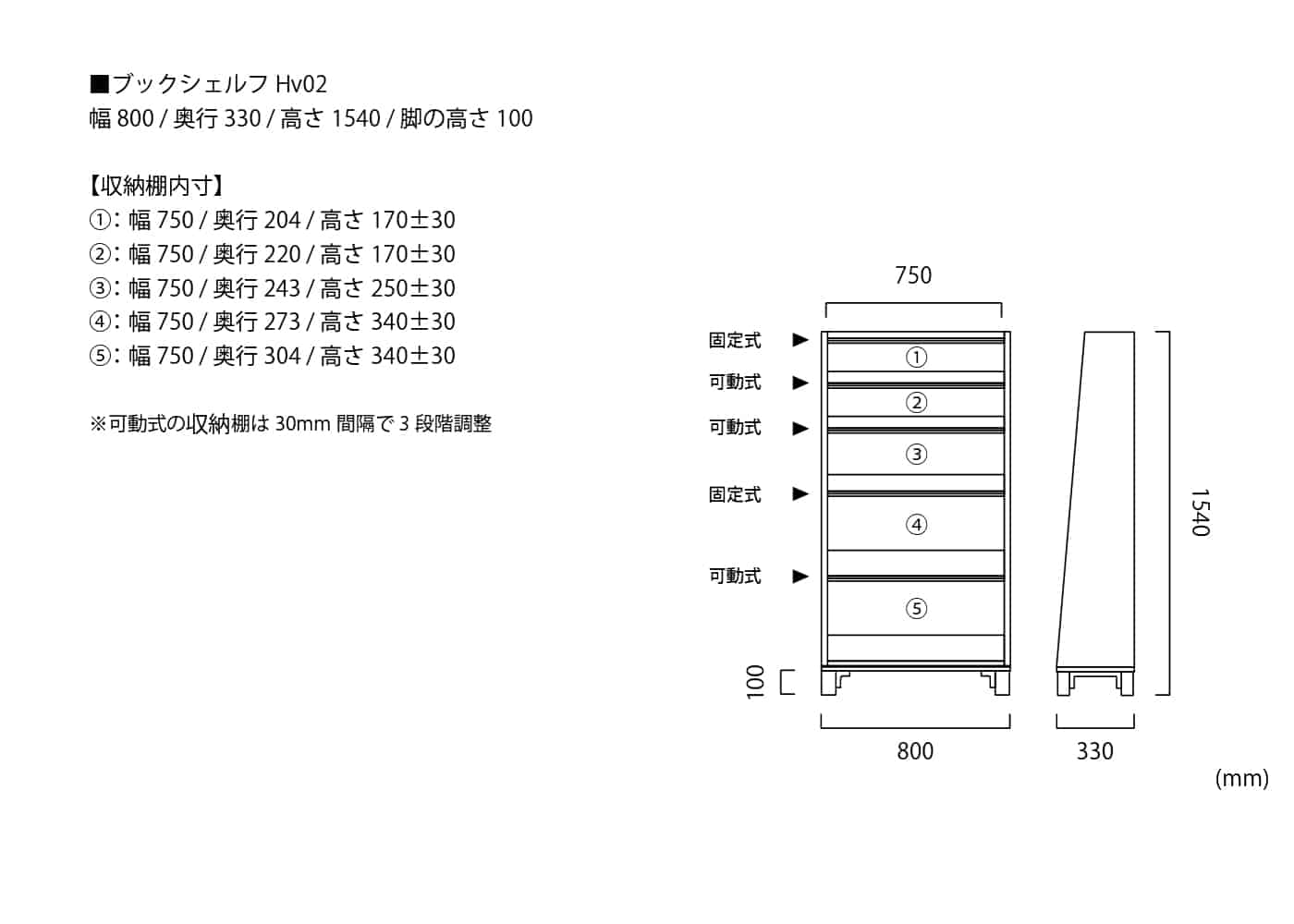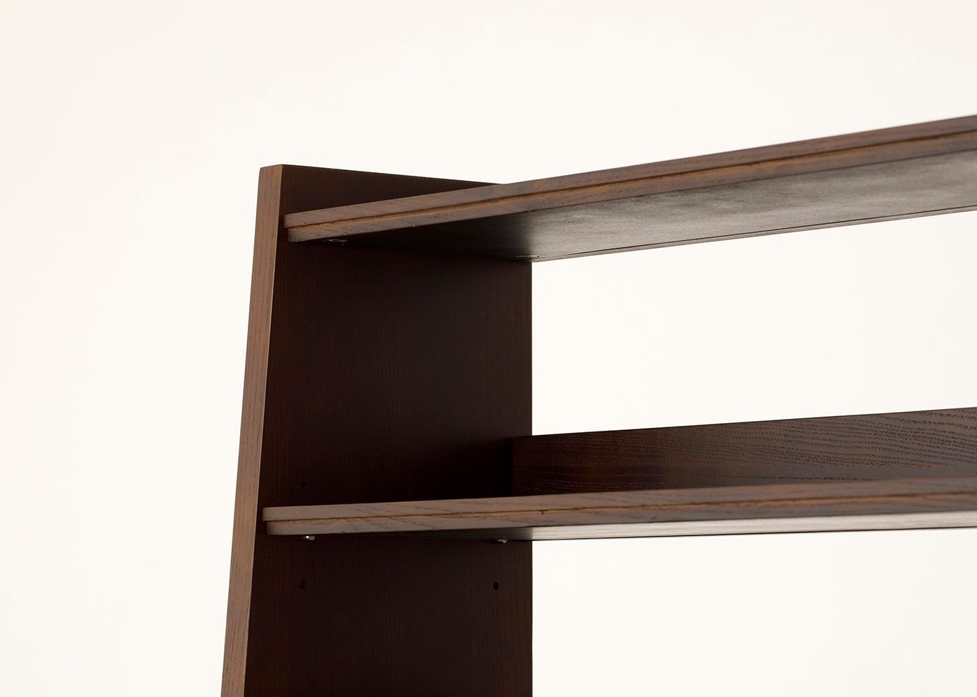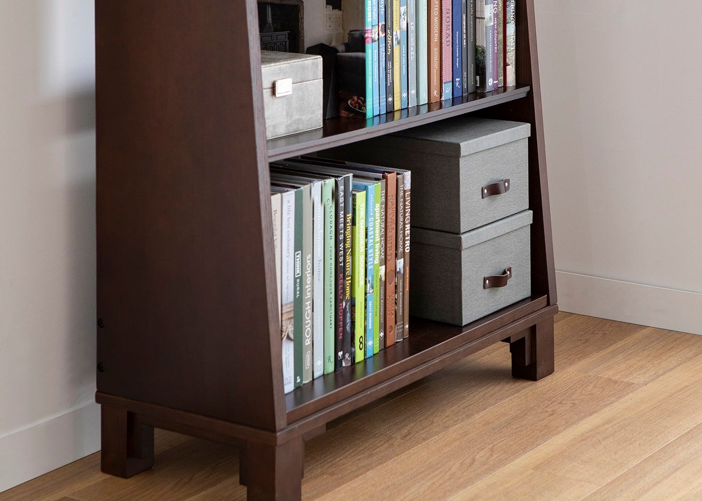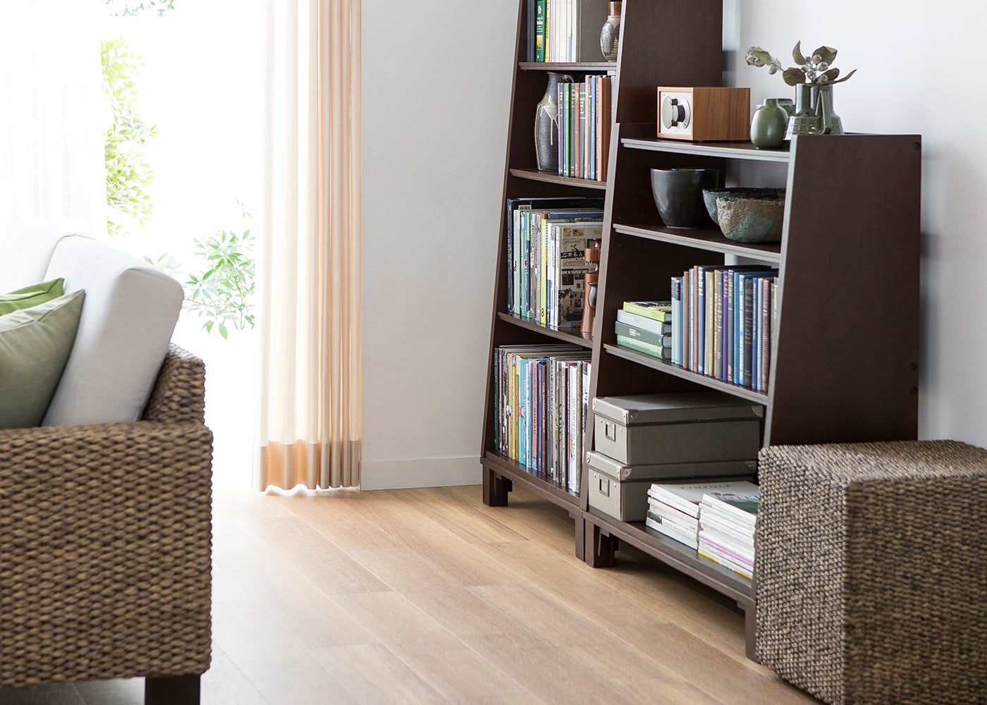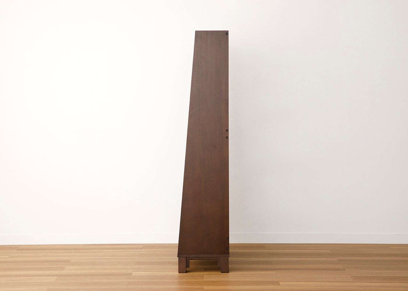 空間をすっきり魅せるために側板を斜めにカットした、独特のデザインが魅力のブックシェルフ Hv02。