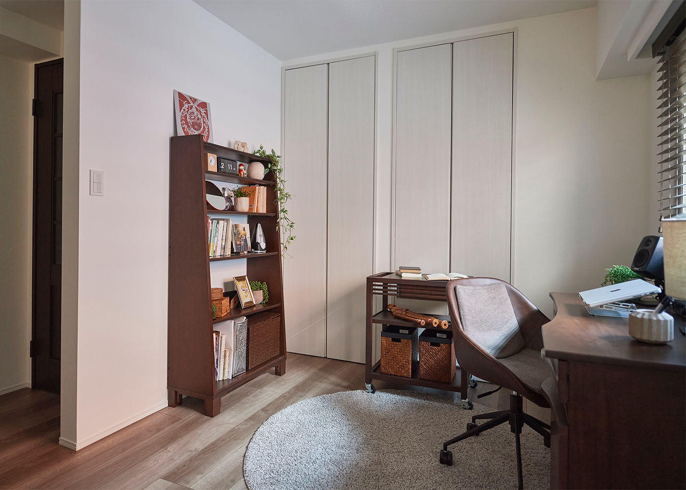 1LDKのリビングから繋がる書斎のスペース。元々はリビングとは別の部屋でしたが、扉をリフォーム時に取ることで、狭くなりがちな書斎空間でも開放的な空間として演出できました。仕事が捗るワゴンや本棚を配置した点もポイントです。