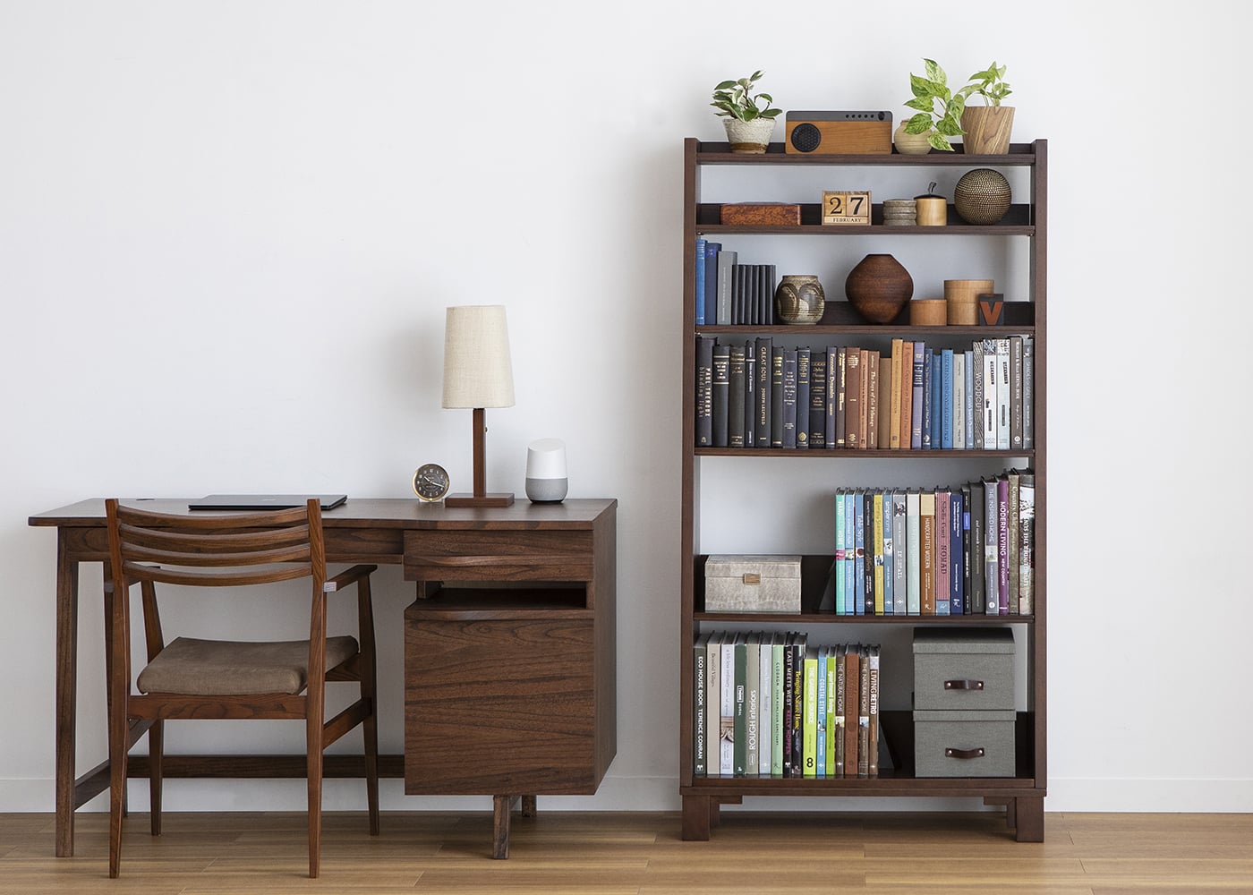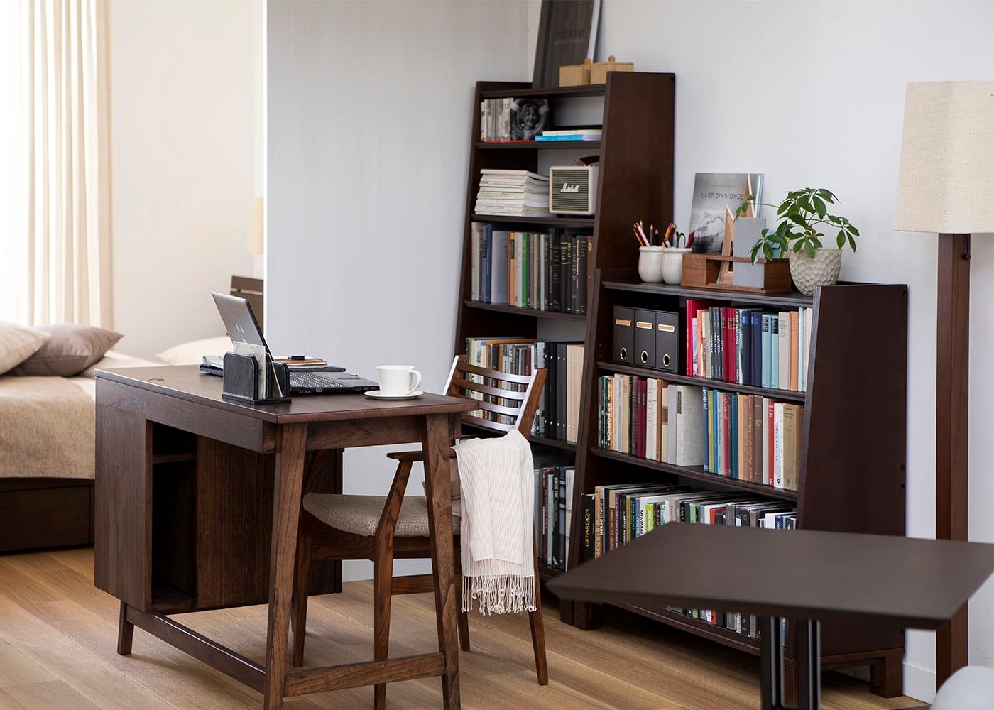 1LDKにブックシェルフを組み合わせたコーディネート例。ワークデスクと共にレイアウトすることで、自宅でも快適に仕事が進む空間を作れます。同シリーズの