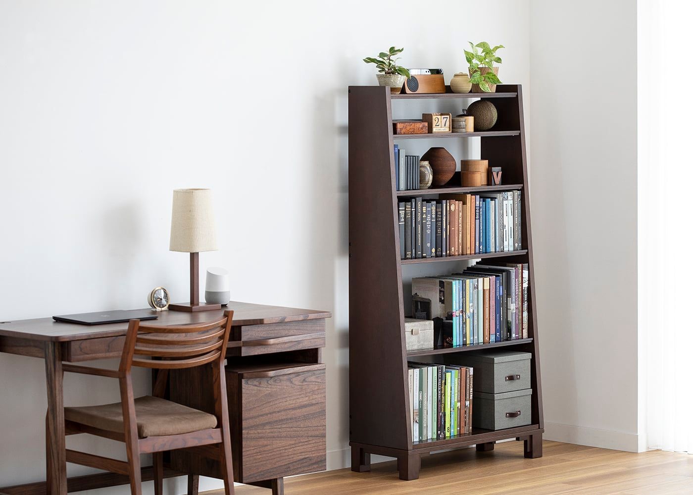 デスク横にあると助かる、コンパクトで収納力の高い書斎用の本棚として活躍します。抜け感のある