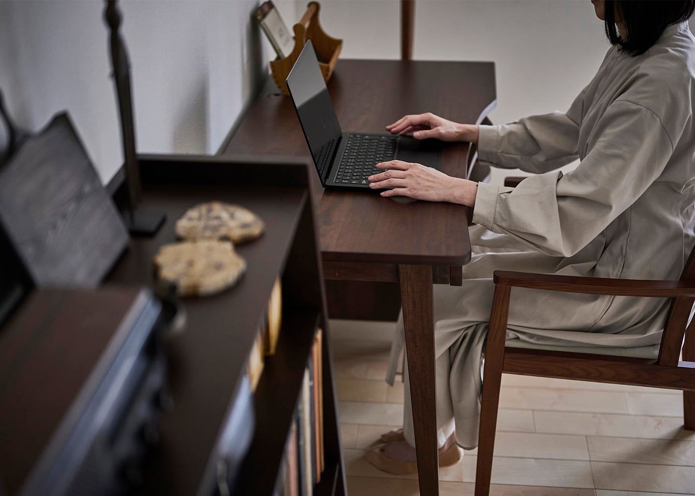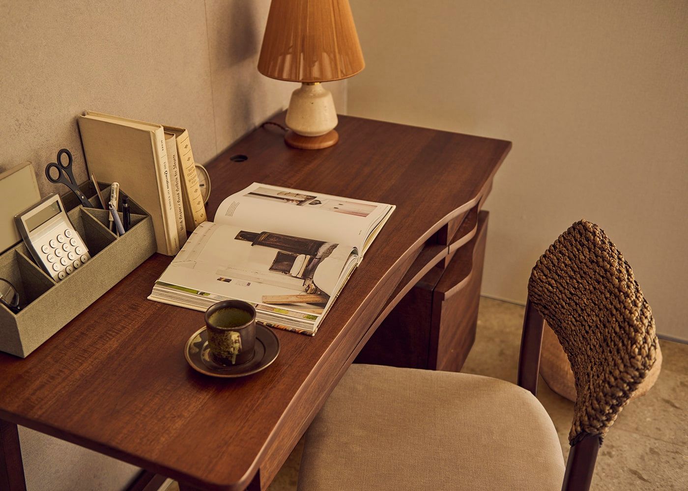 弧を描くデスク天板とチェアの背もたれやフレームの丸みは、見た目はもちろん、使う人の体に寄り添うやさしいデザイン。ゆっくり読書を楽しめる大きな天板もワークデスクの魅力です。