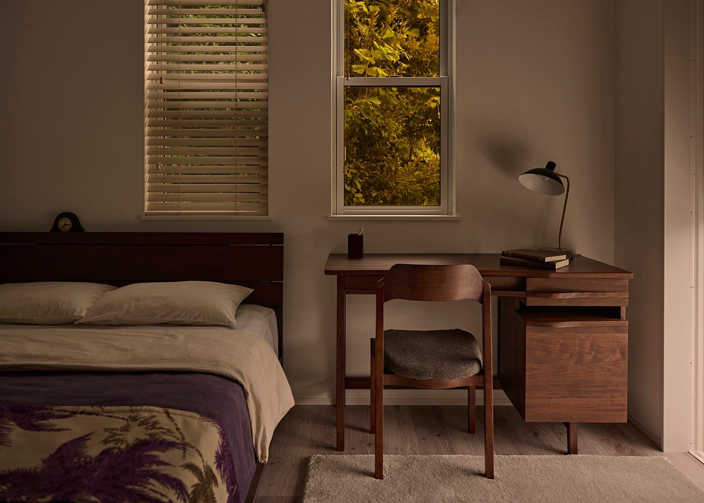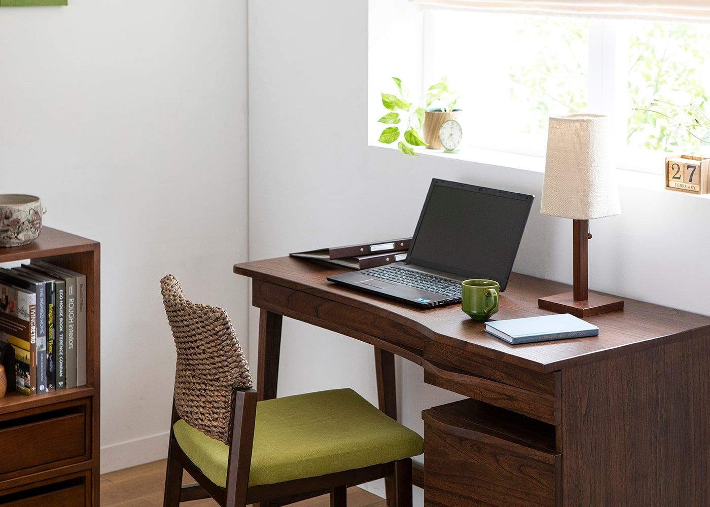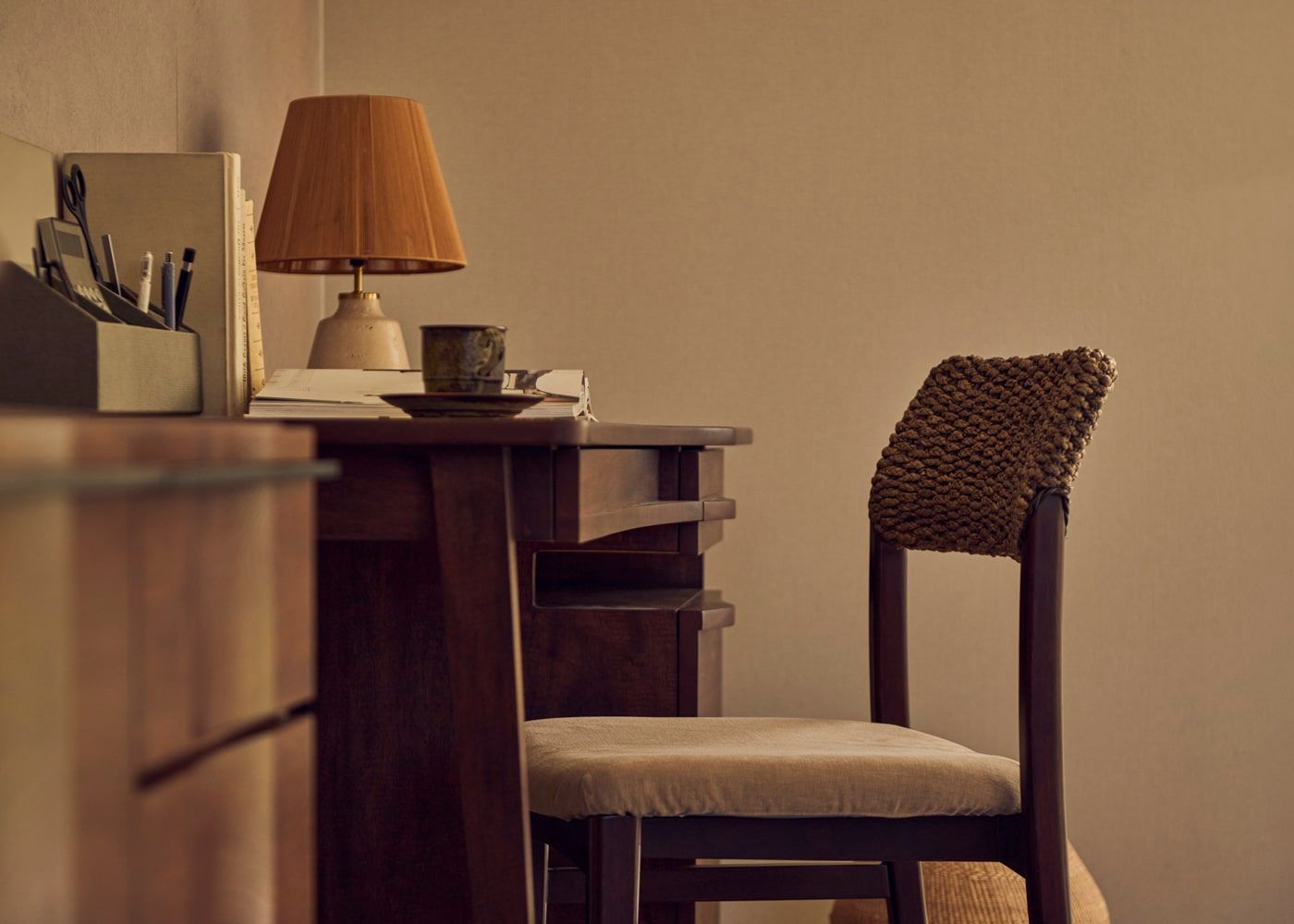 ヒヤシンスチェアを取り入れた、天然素材の温もりに包まれた自分だけのワークスペース。腰窓の前にデスクをレイアウトすれば、爽やかな光を感じられる特等席の完成です。