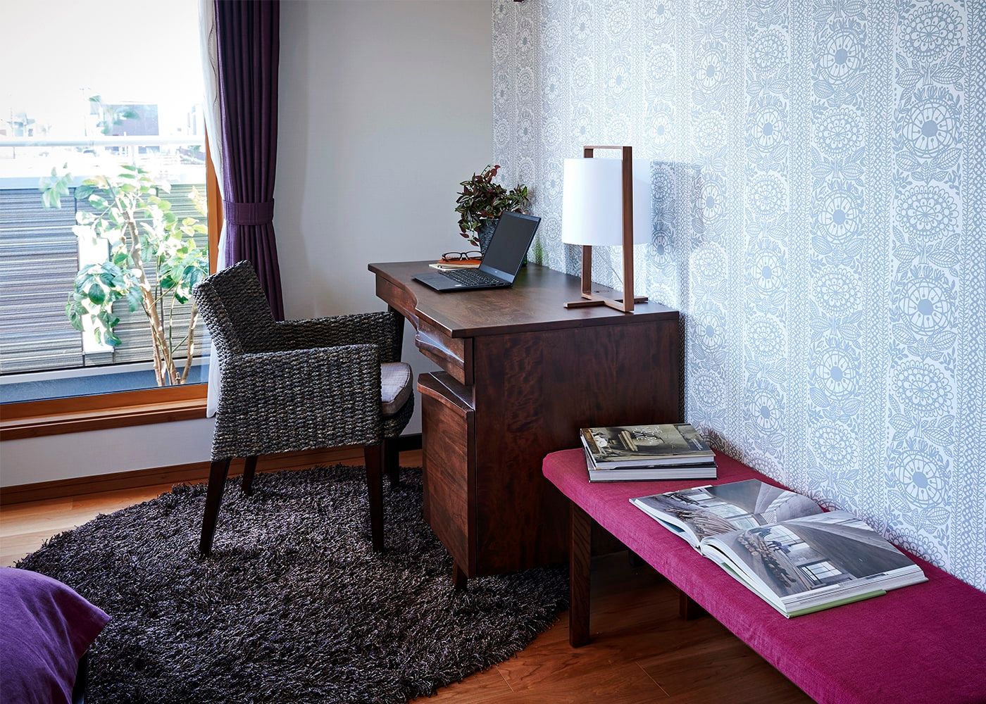 パープルと相性の良いグレーは、空間を落ち着かせ艶やかなパープルをより引き立ててくれます。温もりを感じる無垢材のワークデスクには、ダークグレーのヒヤシンス素材のチェアを合わせて落ち着いた色合いの空間に。