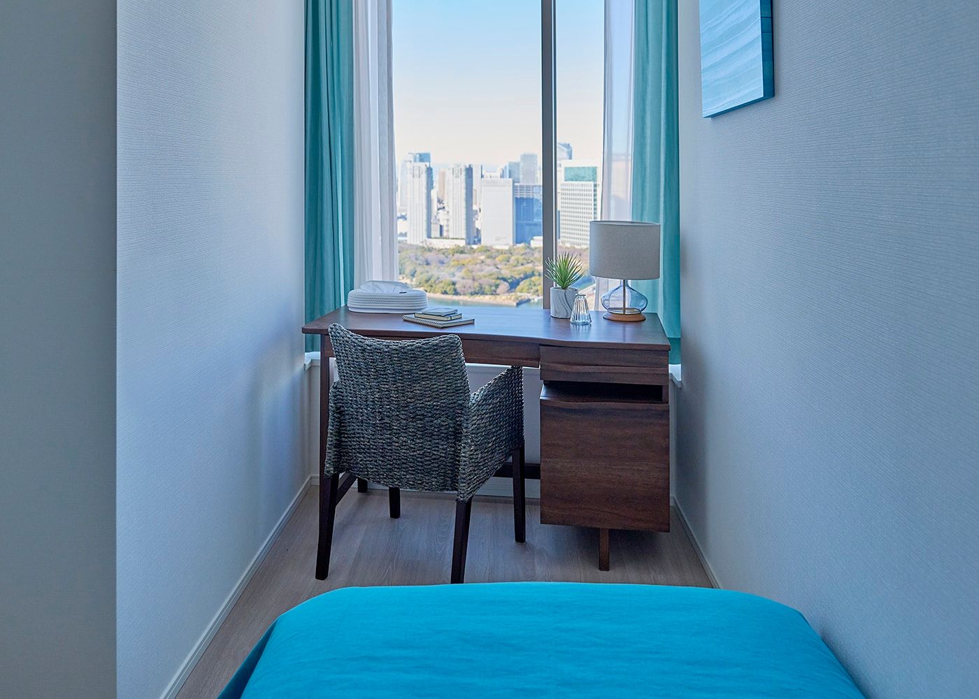 ワークスペースと寝室を兼ね備えた部屋では、機能性と快適さを両立させることが求められます。スマートなワークデスクや、爽やかなブルーのインテリアで、ホテルのような上質な空間を演出。