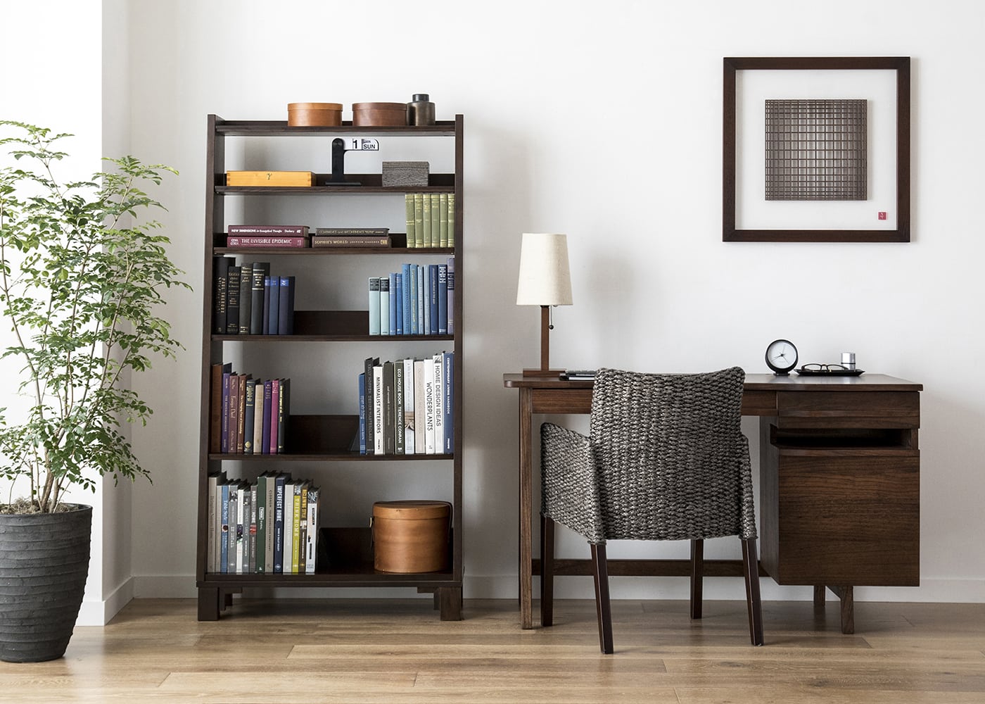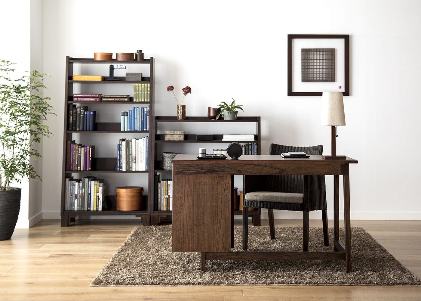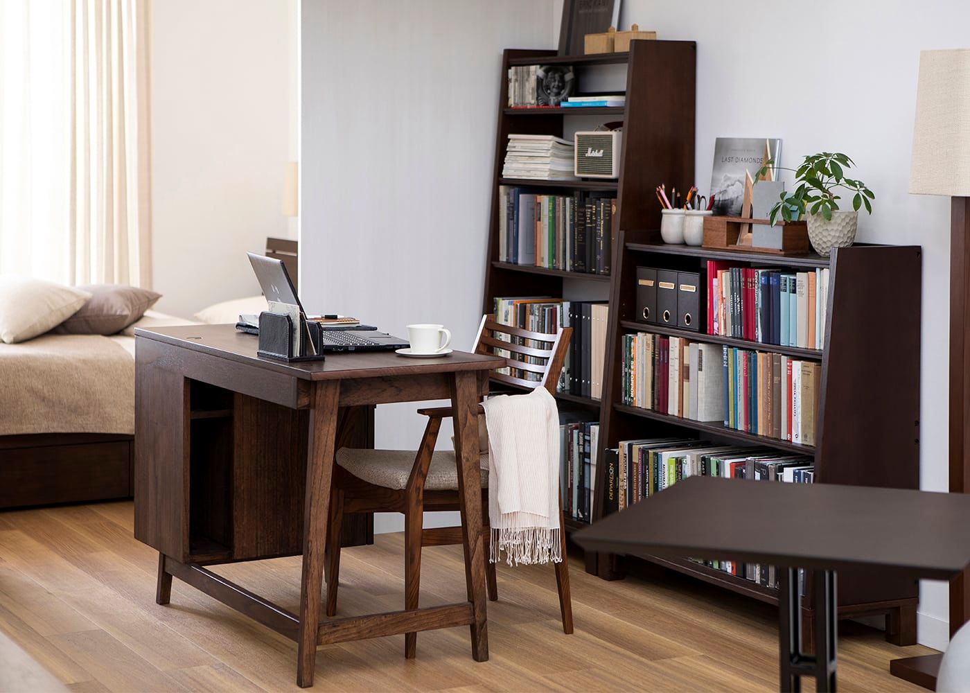 本棚を並べた際にも、背面をきれいに仕上げたデスクならお部屋の中央にレイアウトできます。理想の書斎コーディネートの幅が広がる魅力的なデスクです。