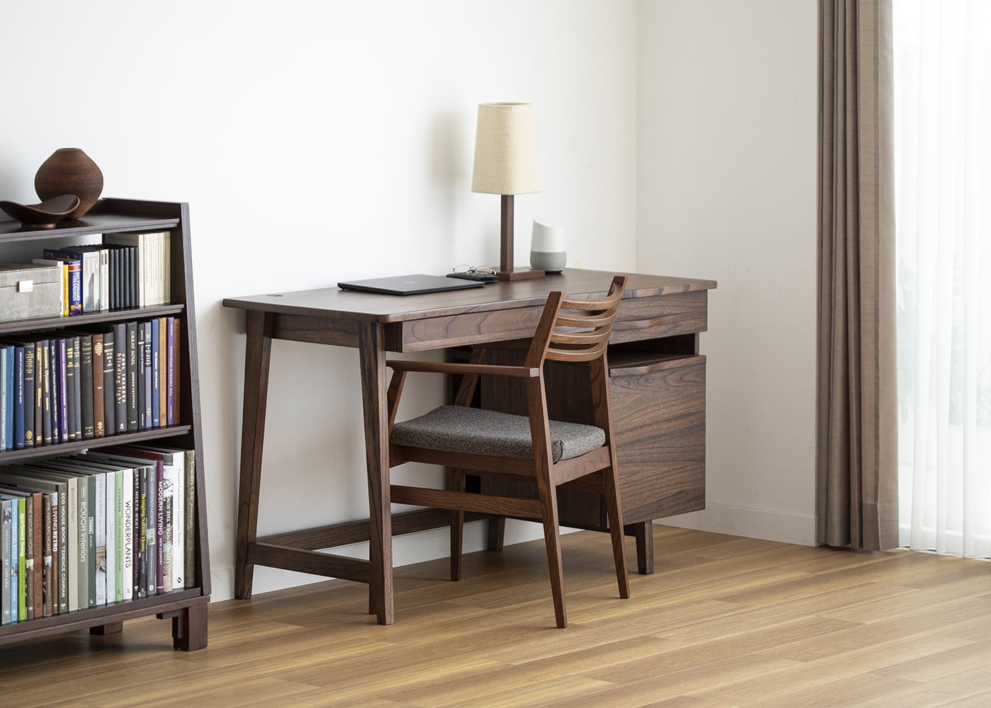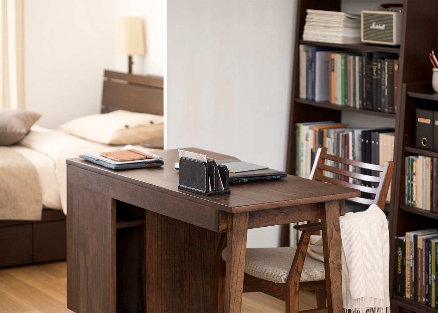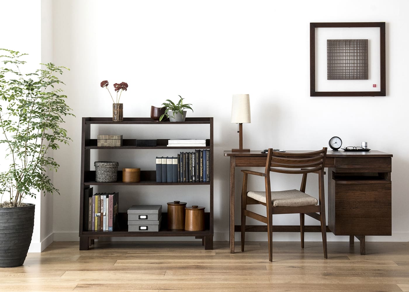 本棚を並べた際にも、背面をきれいに仕上げたデスクならお部屋の中央にレイアウトできます。理想の書斎コーディネートの幅が広がる魅力的なデスクです。
