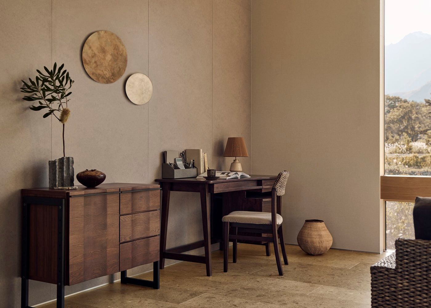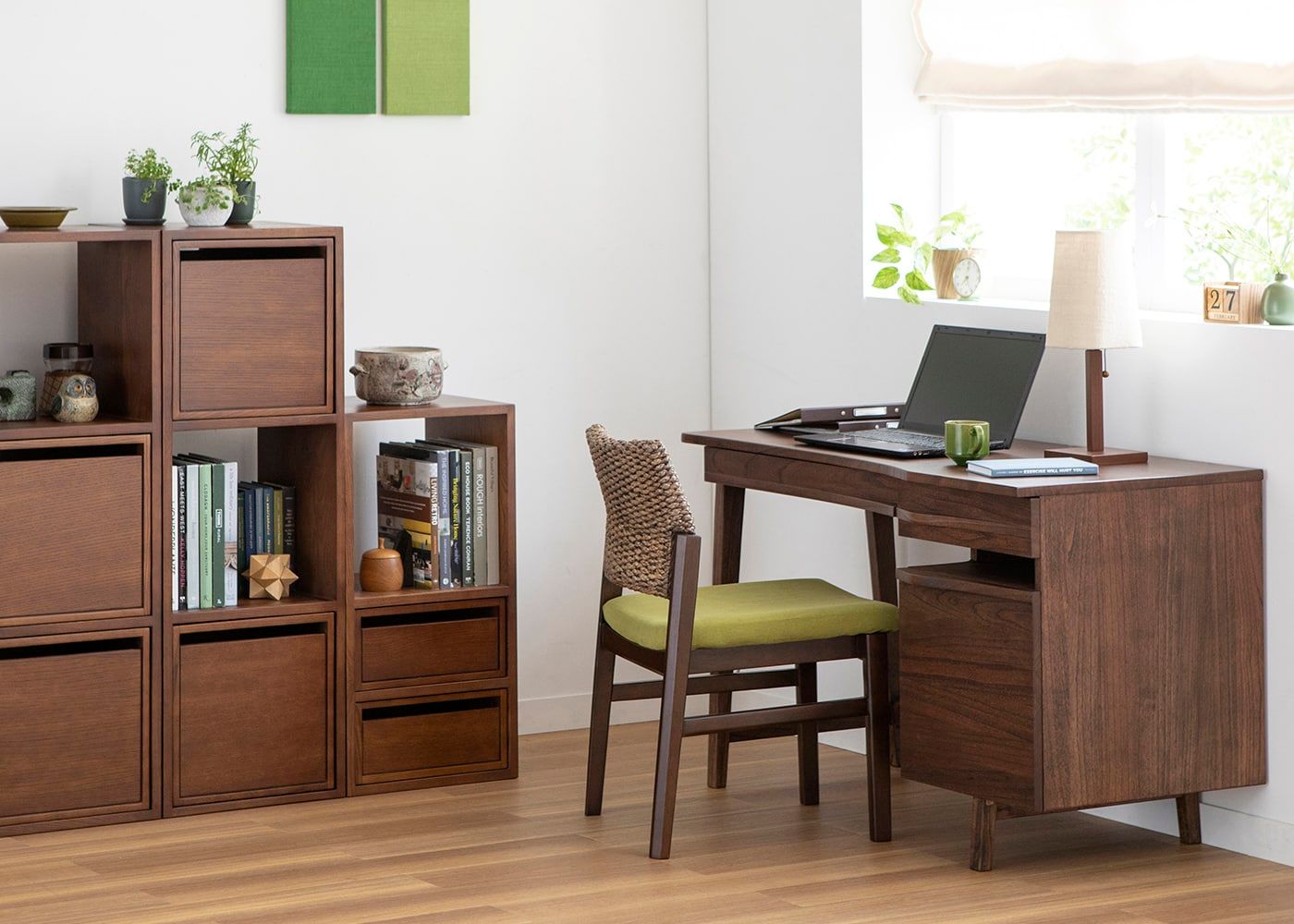無垢材の魅力を引き立てるグレインブラウン色でまとめた、シックな中にも自然素材の温かみを感じる書斎コーディネート。