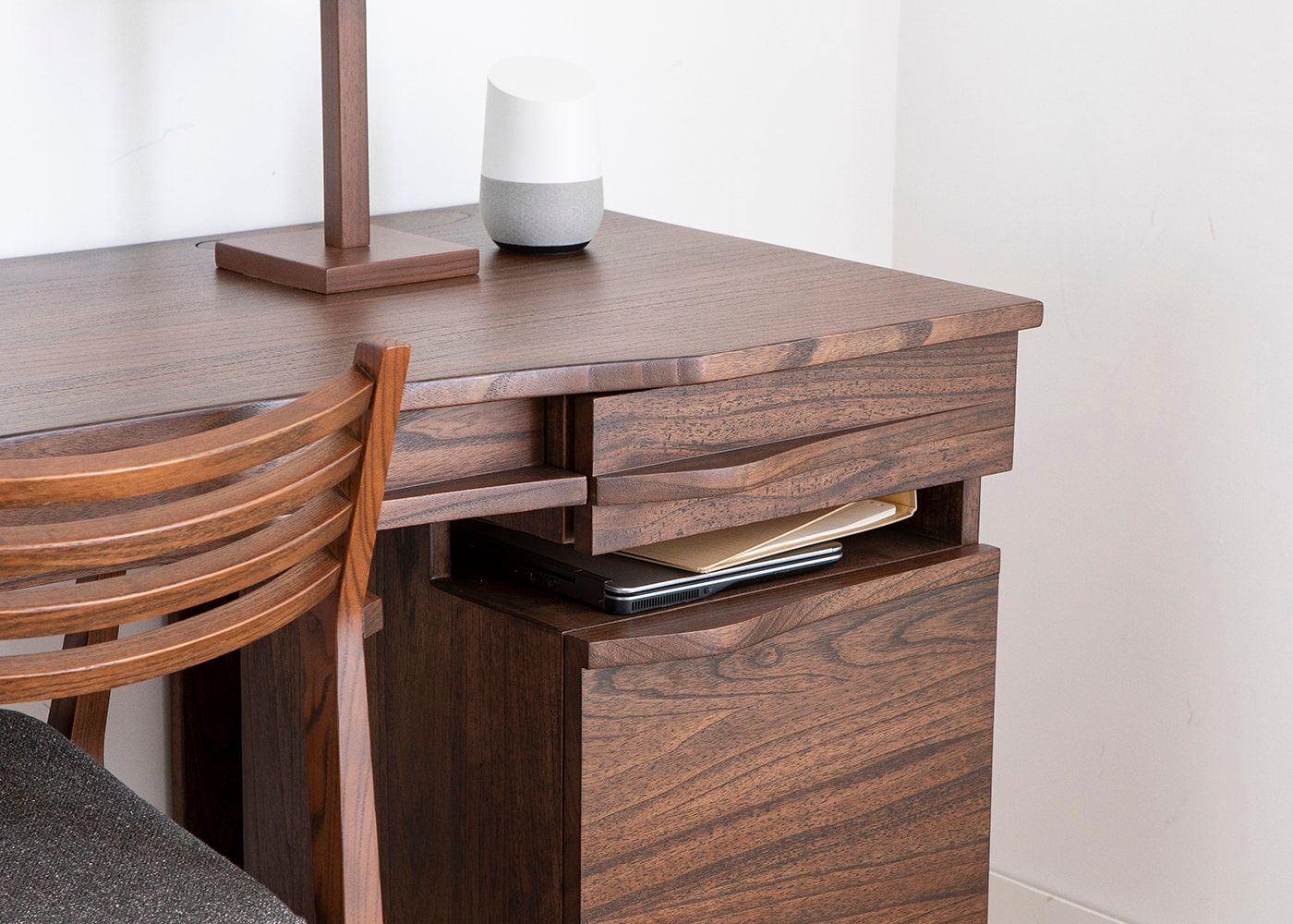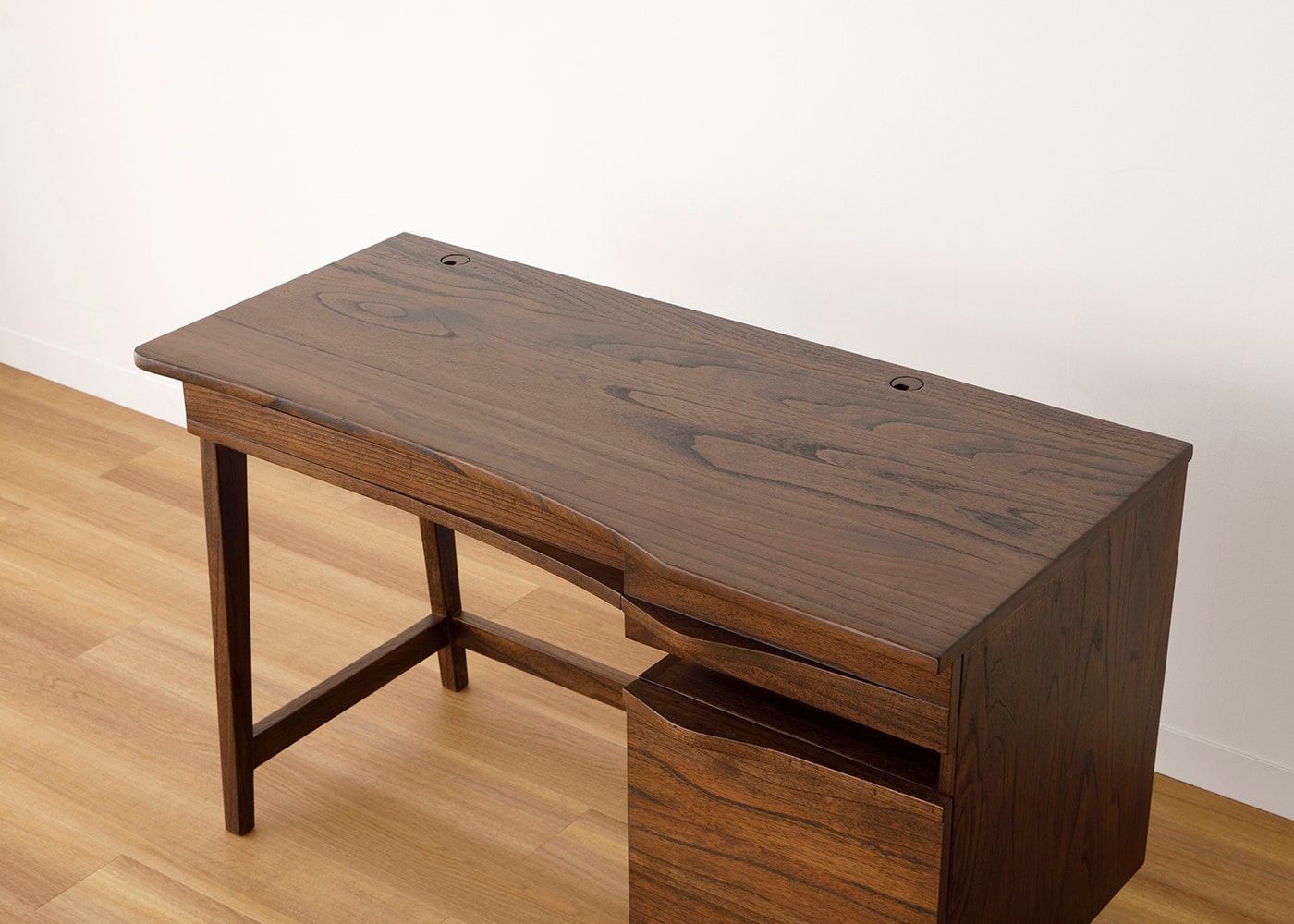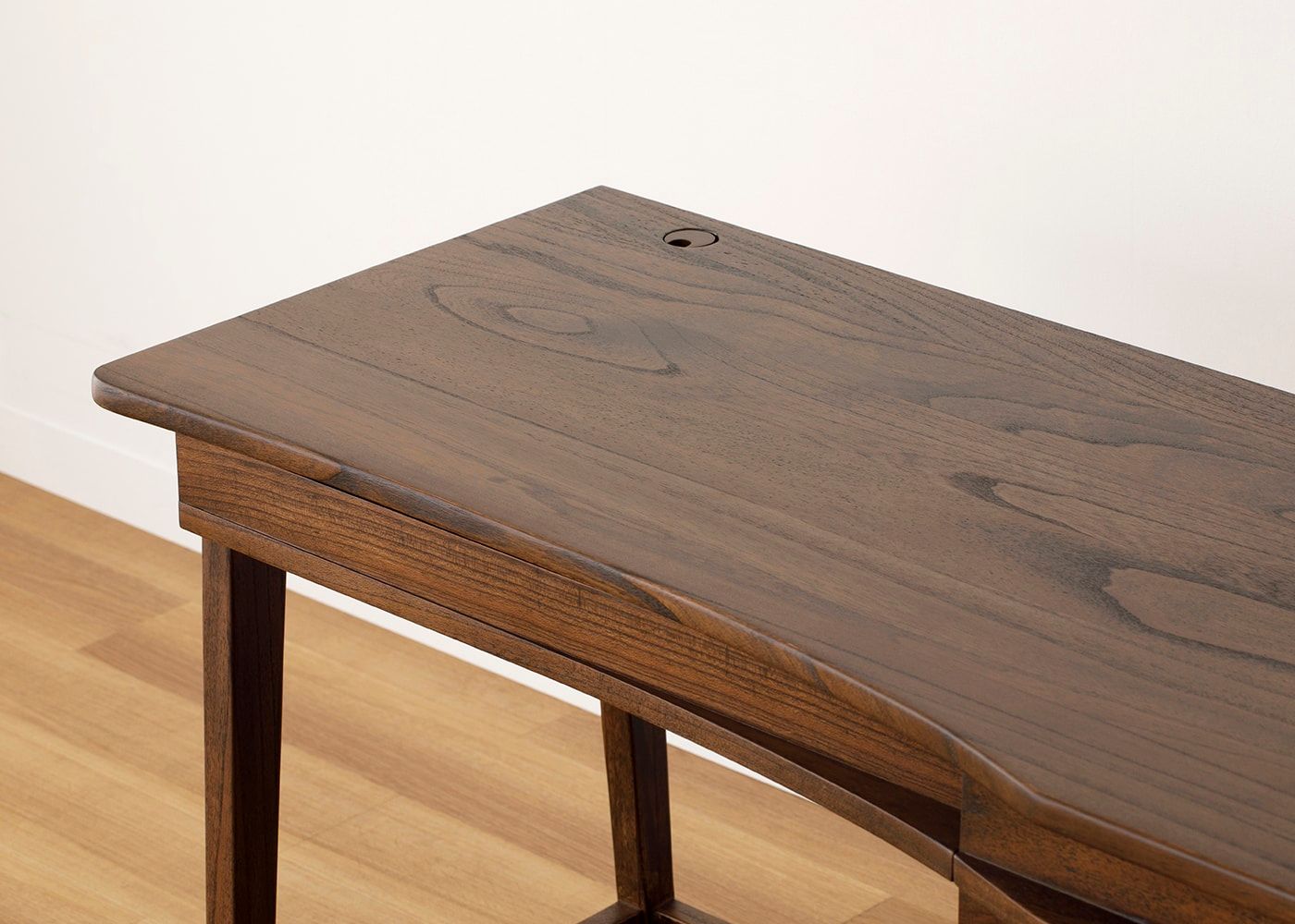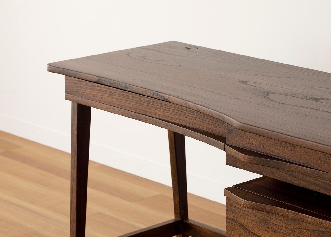デスクを使う時に一番触れる天板や取っ手は、滑らかなカーブを描くように無垢材を削り出したやさしいフォルムに。作業する人のことを考えた、こだわりのデスクデザインです。