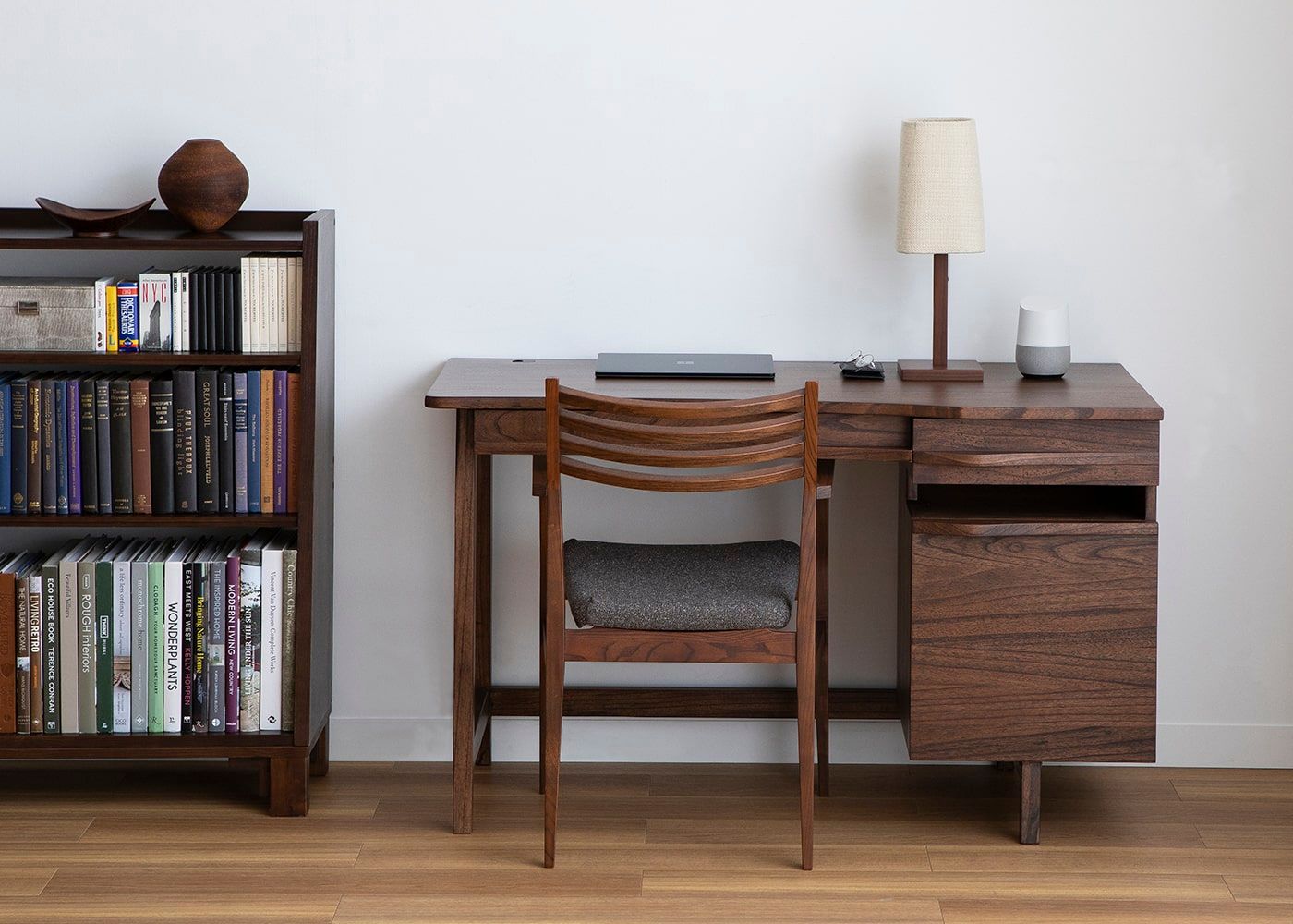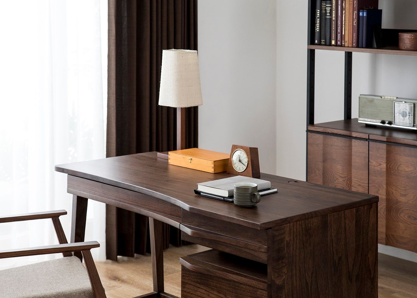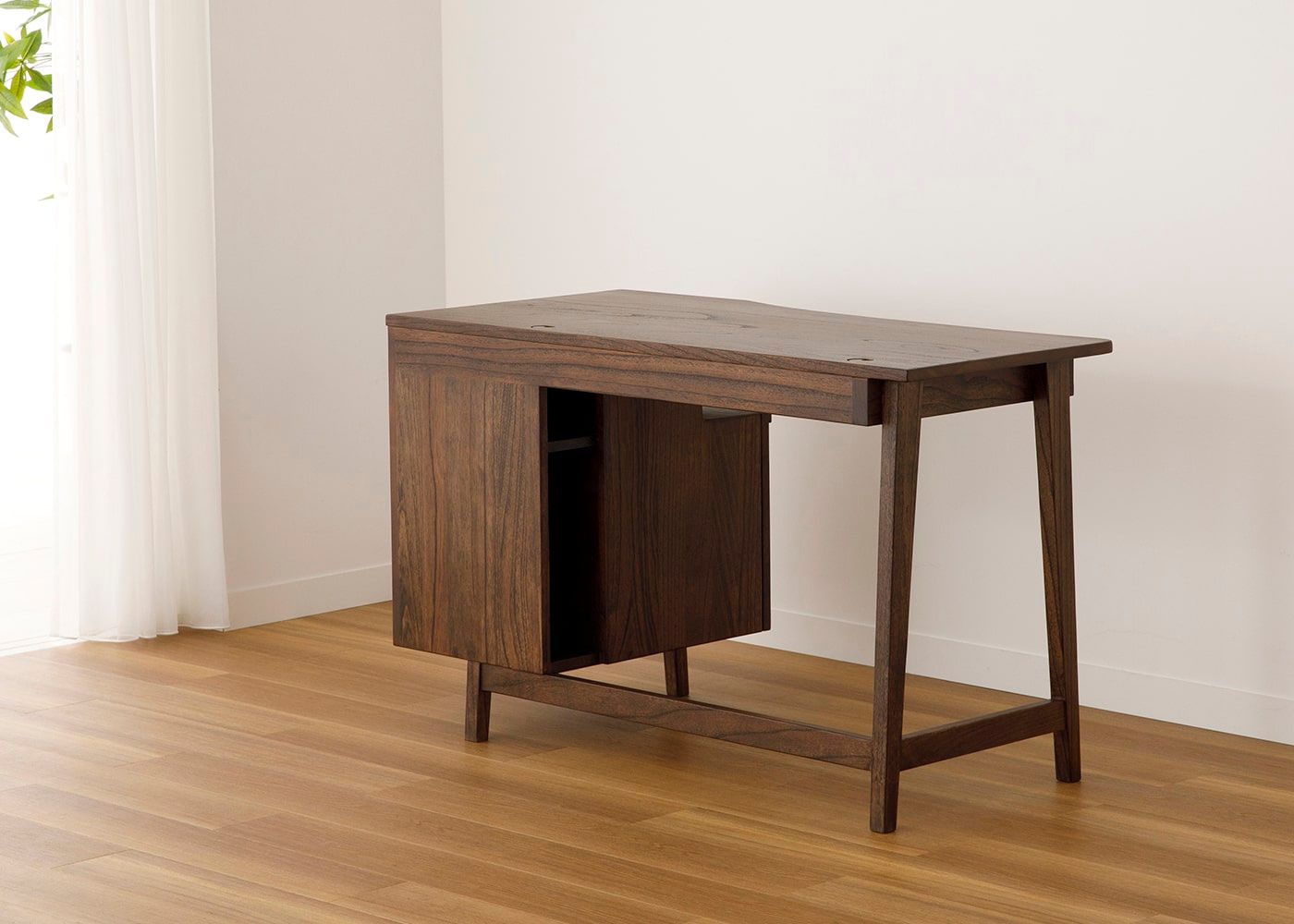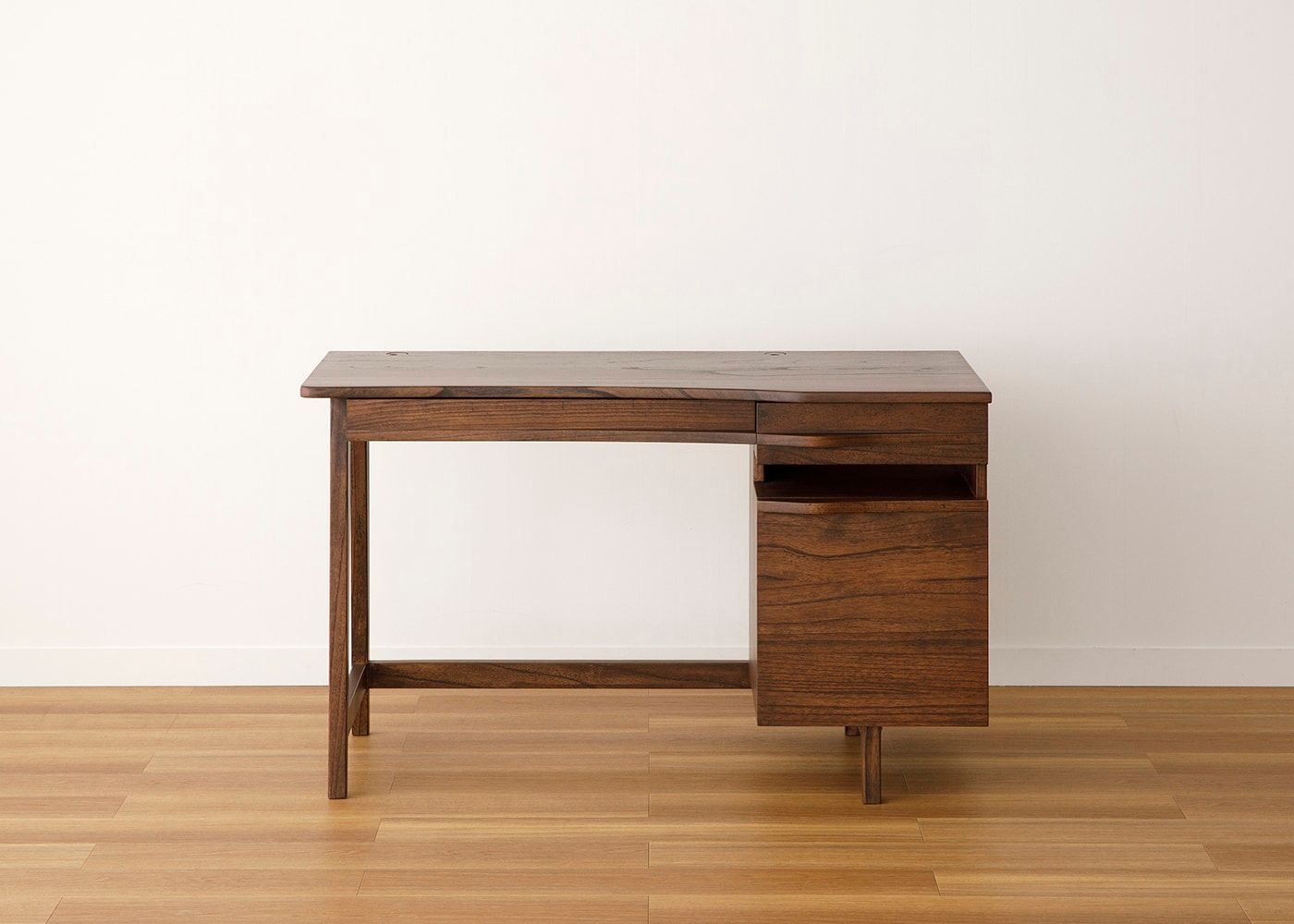 デスクを使う時に一番触れる天板や取っ手は、滑らかなカーブを描くように無垢材を削り出したやさしいフォルムに。作業する人のことを考えた、こだわりのデスクデザインです。