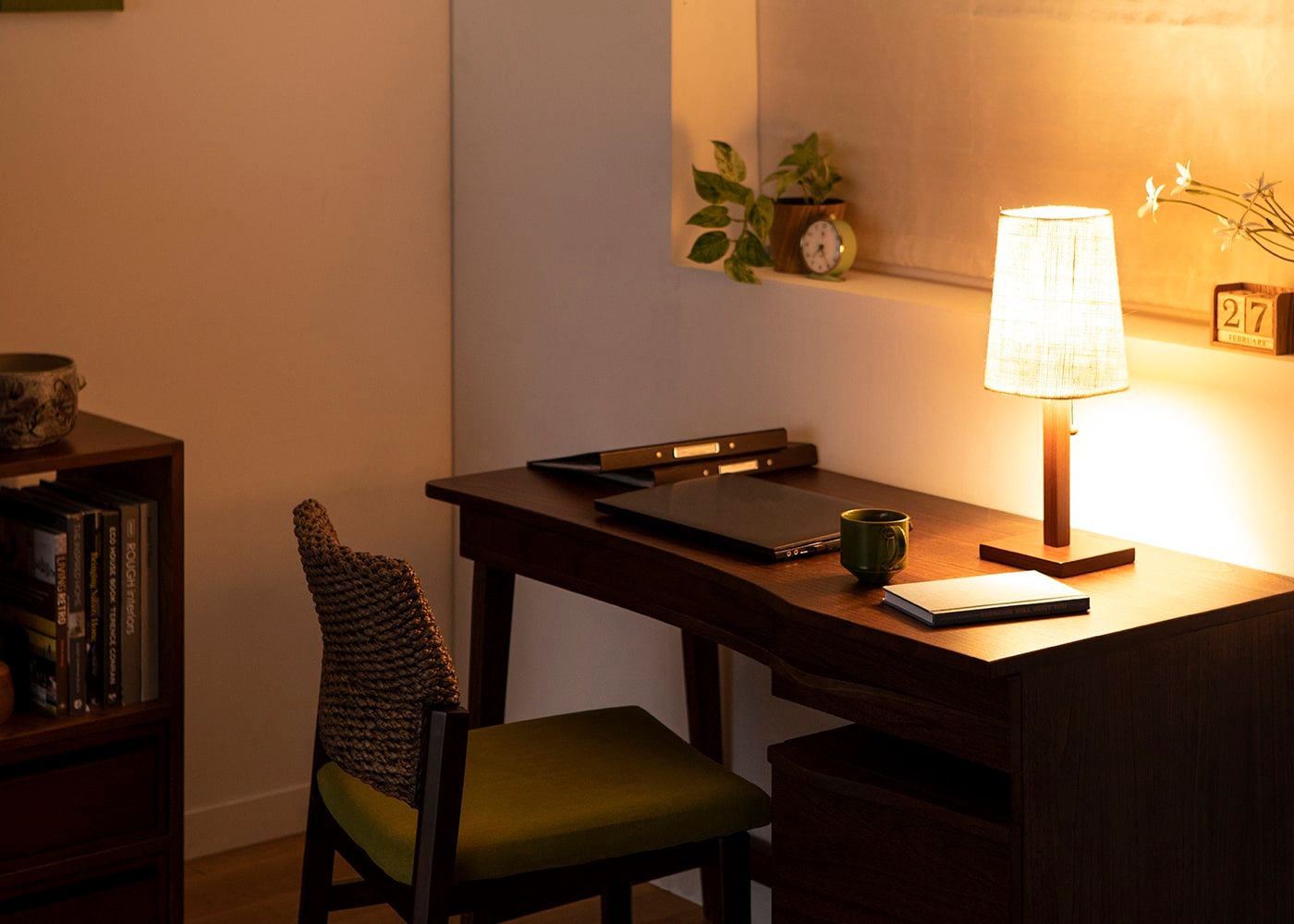 ジュート照明から漏れる灯りが書斎全体を包み込み、頑張った後の疲れを癒してくれます。