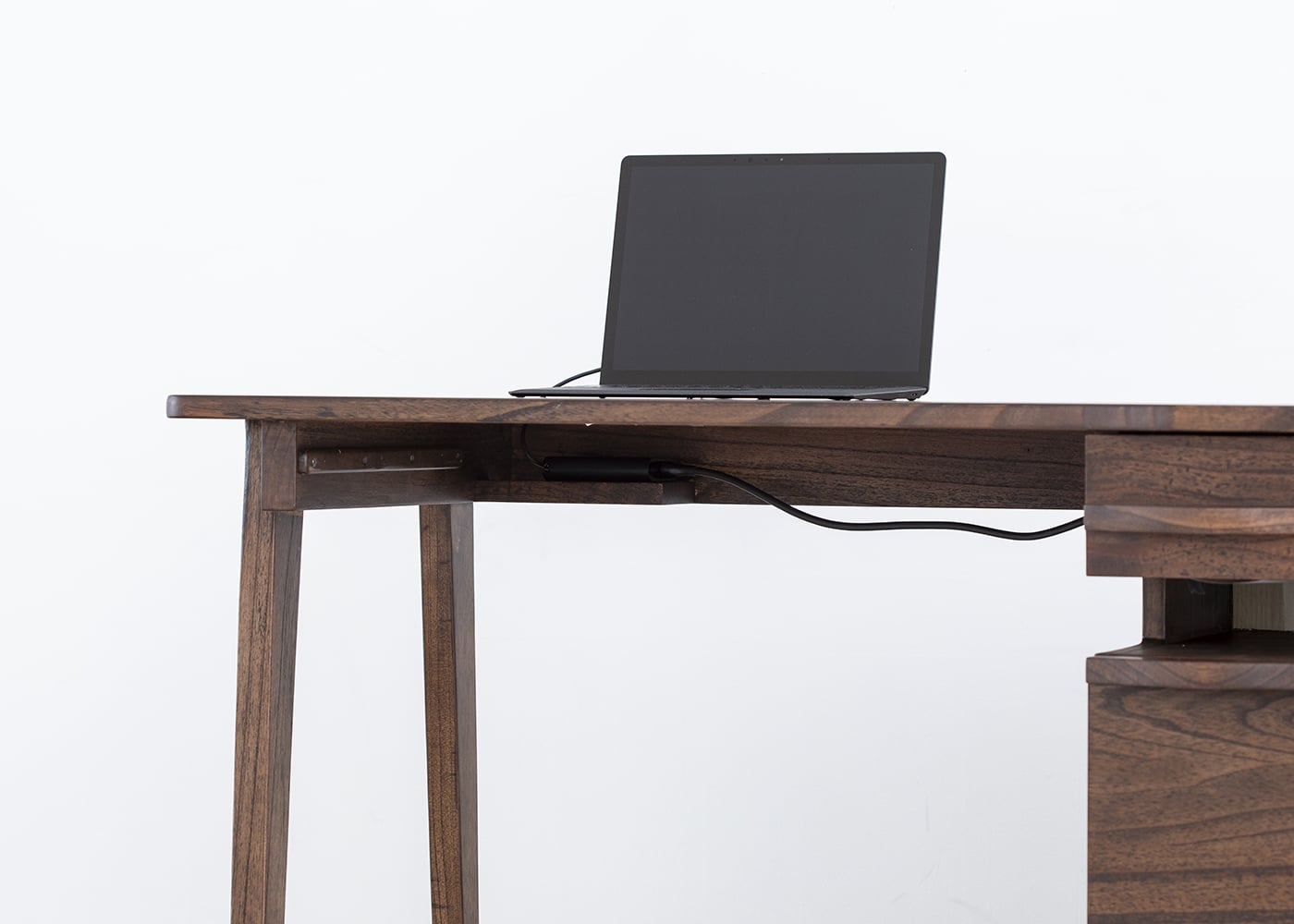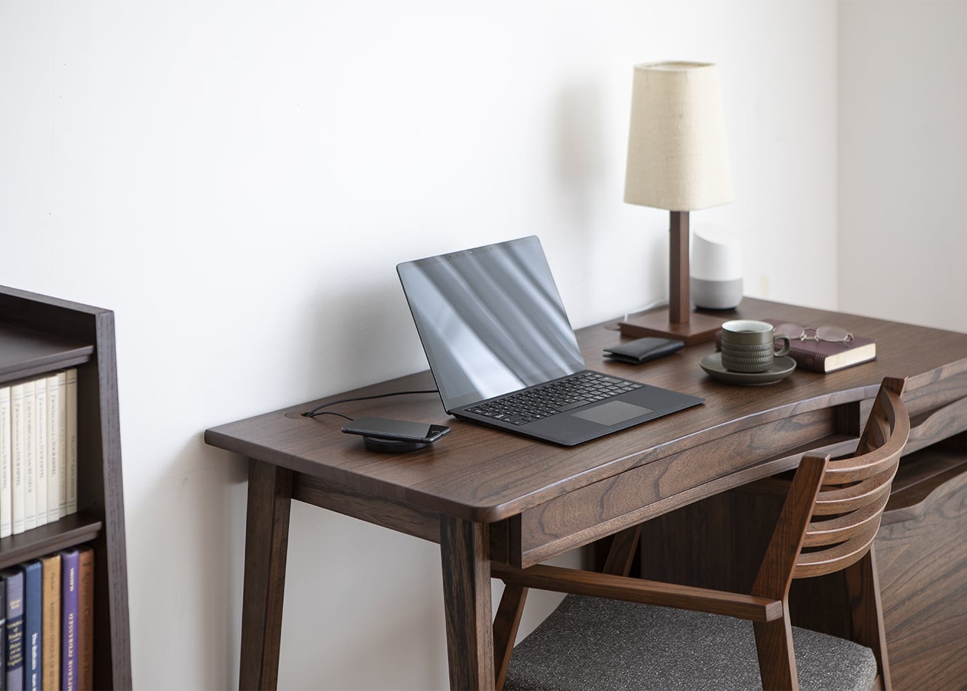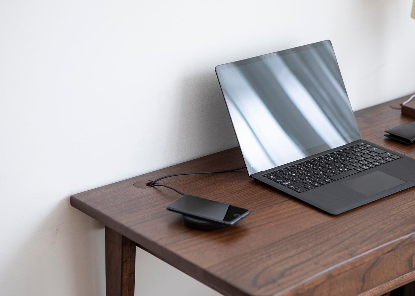 例えば、天板左側の配線穴からはパソコンの電源コードやLANケーブル、スマホを置くだけで充電できるワイヤレス充電器の電源コードを出すことができます。テーブル上にコードが少なくすっきりしています。