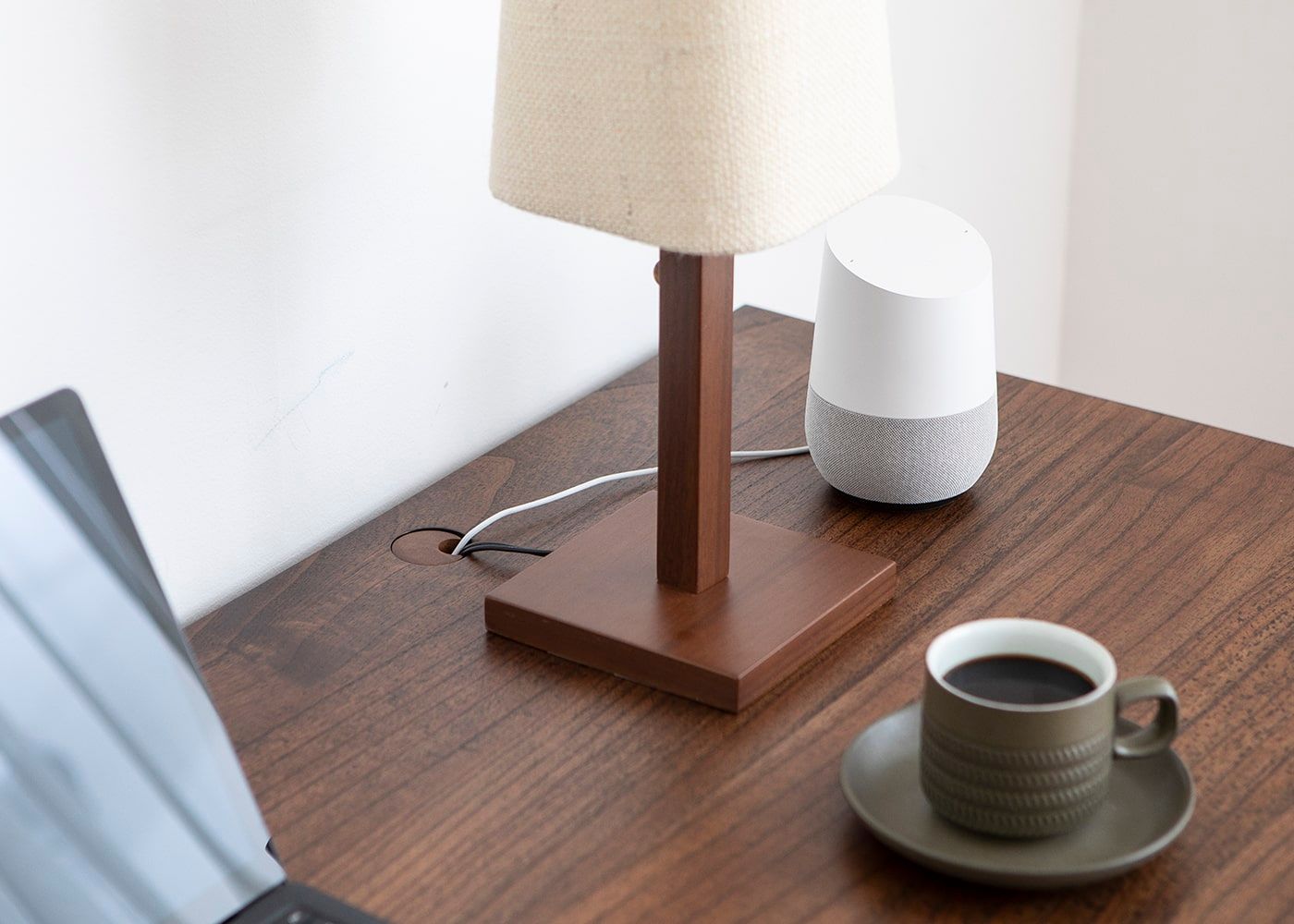 テーブルランプやAIスピーカーなどの電源コードを通すことが可能。電子機器が多くなればなるほど便利な反面、ごちゃごちゃとした配線が気になるのですが、その悩みを解消してくれるのがこのデスクの魅力です。