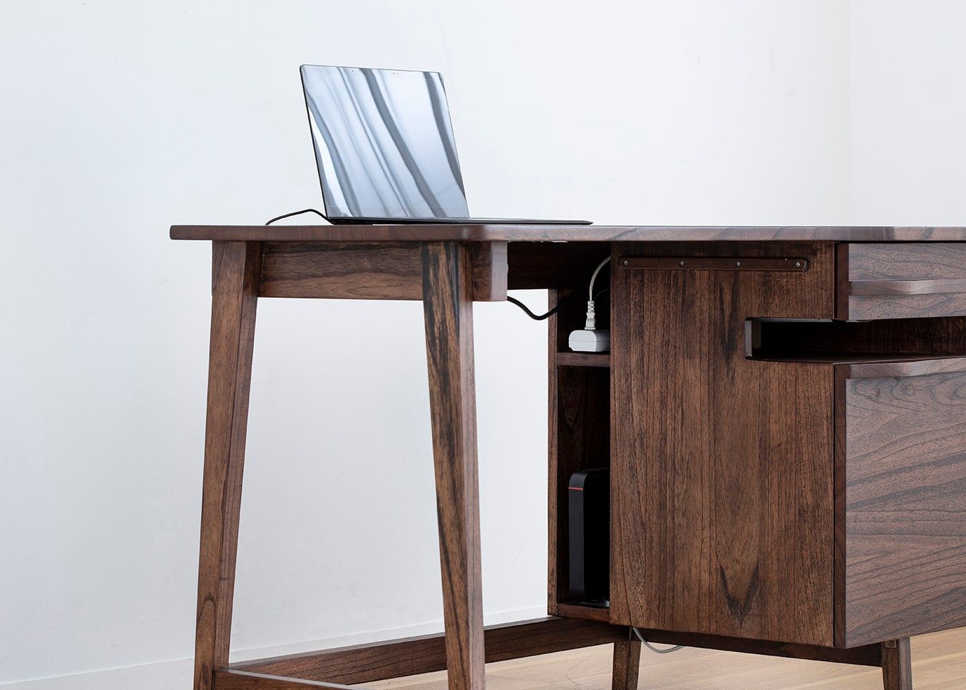 引出(右)の奥にも隠し収納スペースがあり、そこに電源タップやWifiルーターなどが収納可能です。例えば、天板の配線穴からパソコンのアダプターのコードを通して、隠し収納にある(写真白色の)電源タップに差し込みます。その電源タップのコードを隠し収納の一番下の穴から出して、壁のコンセントに差し込んで電源を取ることが可能です。「たくさんの電子機器の配線をまとめてデスク周りの配線をすっきりさせる」という機能性や収納力を追求しました。