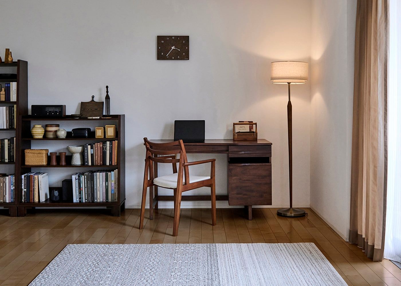 アームチェアを組み合わせたコンパクトな書斎コーディネートもおすすめです。シェルフ部分やガラス扉の抜け感と無垢材の重厚感が調和した魅力的な書斎を演出できます。